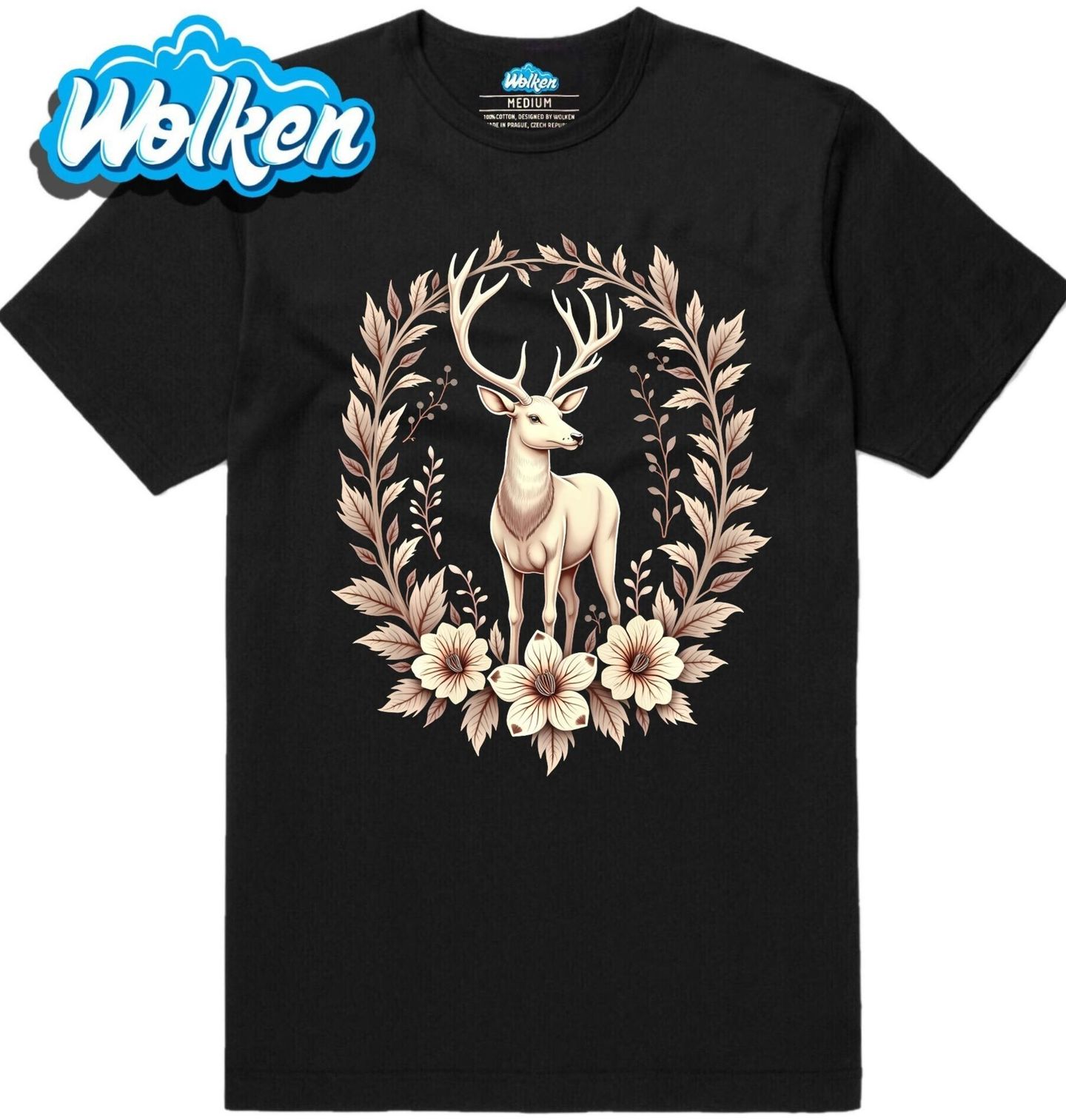 Pánské tričko Ušlechtilý Jelen. Tento motiv znázorňuje majestátního jelena obklopeného květinami a listím, který symbolizuje sílu, klid a spojení s přírodou. Jemné barvy a elegantní kompozice činí tento design ideální volbou pro milovníky lesní estetiky, přírody a zvířecích motivů.