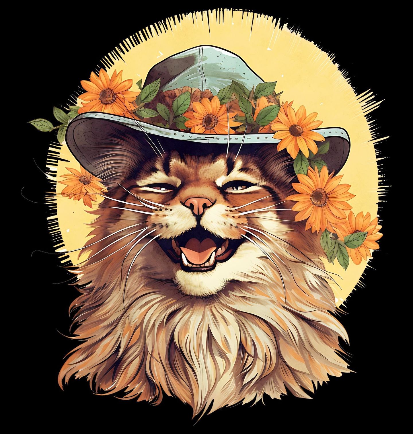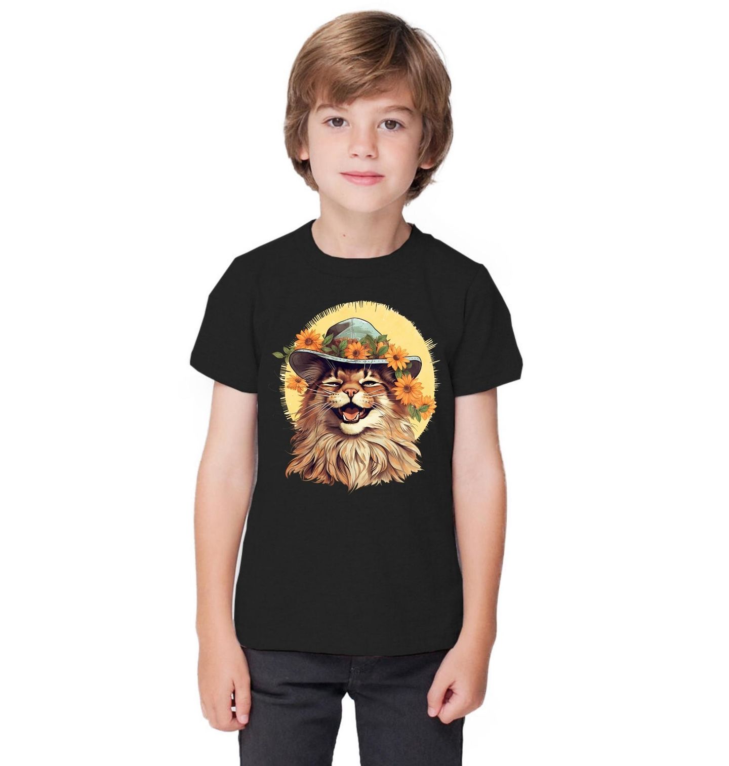 Dětské tričko Usměvavá Mainská mývalí Kočka v Klobouku. Usměvavá kočka v květinovém klobouku přináší radost, optimismus a lehce rozpustilou atmosféru. Tato originální ilustrace zachycuje dlouhosrstou mainskou kočka, která doslova září pod slunečním kruhem a působí jako symbol dobré nálady a letní pohody. Květiny dodávají motivu svěžest, hravost a pozitivní energii.
