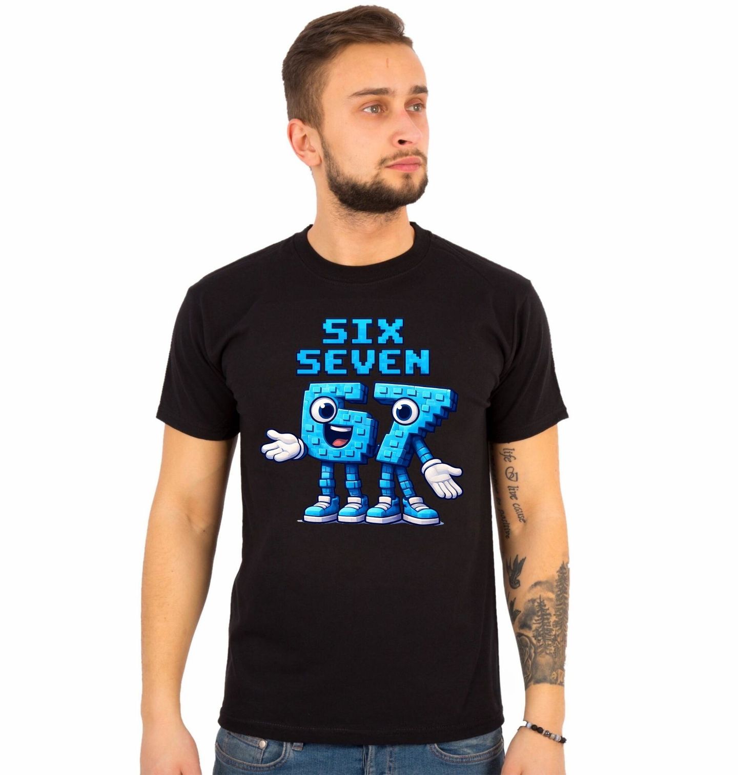 Pánské tričko Usměvavá Šest Sedm 67 Six Seven. Motiv 67 ve stylu six seven meme zobrazuje roztomilé modré číslice 6 a 7 jako živé postavičky. Obě čísla mají velké oči, úsměv a boty, takže působí jako kreslené kamarády. Povrch číslic je tvořený blokovým, kostkovým vzorem, což dodává motivu hravý a zábavný vzhled.