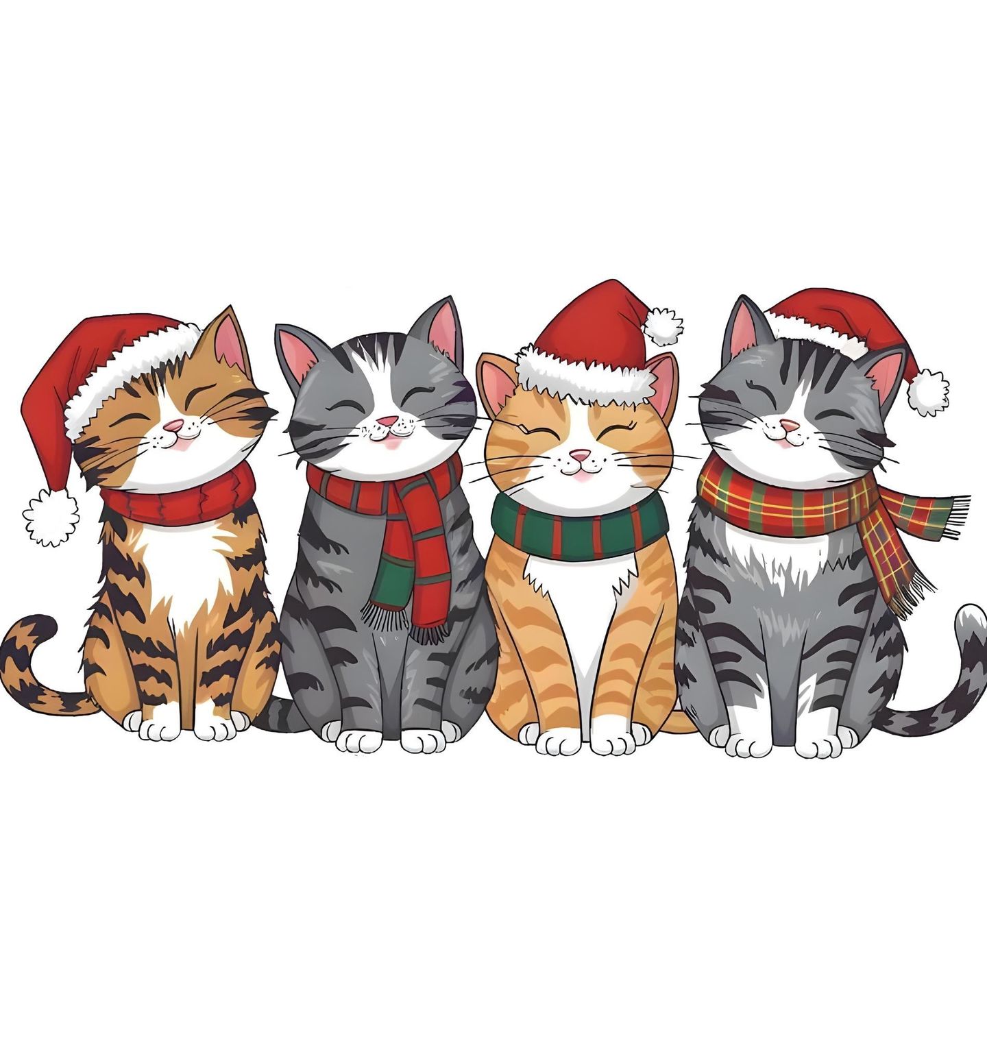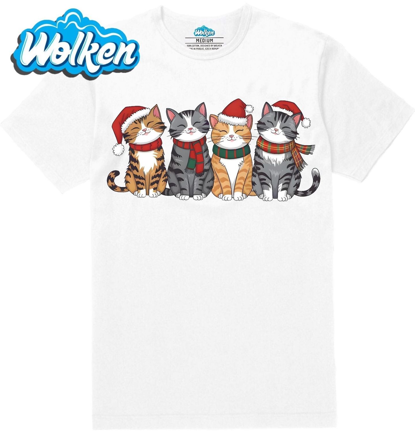Pánské tričko Usměvavé Vánoční Kočky. Roztomilá kočka ve vánočním stylu! Tento motiv představuje čtyři spokojené kočky v čepicích a šálách, které přinášejí radost a vánoční atmosféru. Perfektní dekorace nebo dárek pro všechny milovníky koček a Vánoce.