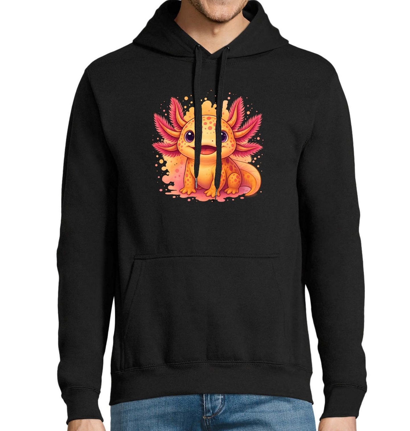 Pánská mikina Usměvavý Axolotl mexický. Axolotl mexický, česky také zvaný vodní dráček, chodící mlok nebo tygří mlok, je středně velký obojživelník vyskytující se v mexických jezerech Lago de Xochimilco. Tento roztomilý Axolotl v teplých odstínech oranžové a růžové s velkýma zářivýma očima působí jako dokonalý společník pro milovníky zvířat i originální módy.