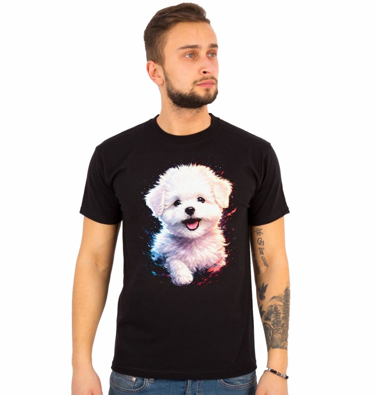 Pánské tričko Usměvavý Bišonek. Tento hravý motiv zobrazuje malého, nadýchaného psa s veselým výrazem a typickou jemnou srstí. Jedná se o plemeno bišonek (Bichon Frisé), které je oblíbené pro svou přátelskou povahu, hravost a roztomilý „plyšový“ vzhled. Moderní barevné zpracování dodává motivu energii a svěžest, díky čemuž zaujme na první pohled. Každý pejskař si zamiluje tento veselý design, který skvěle vystihuje radost a pozitivní energii, jakou tento pes přináší.