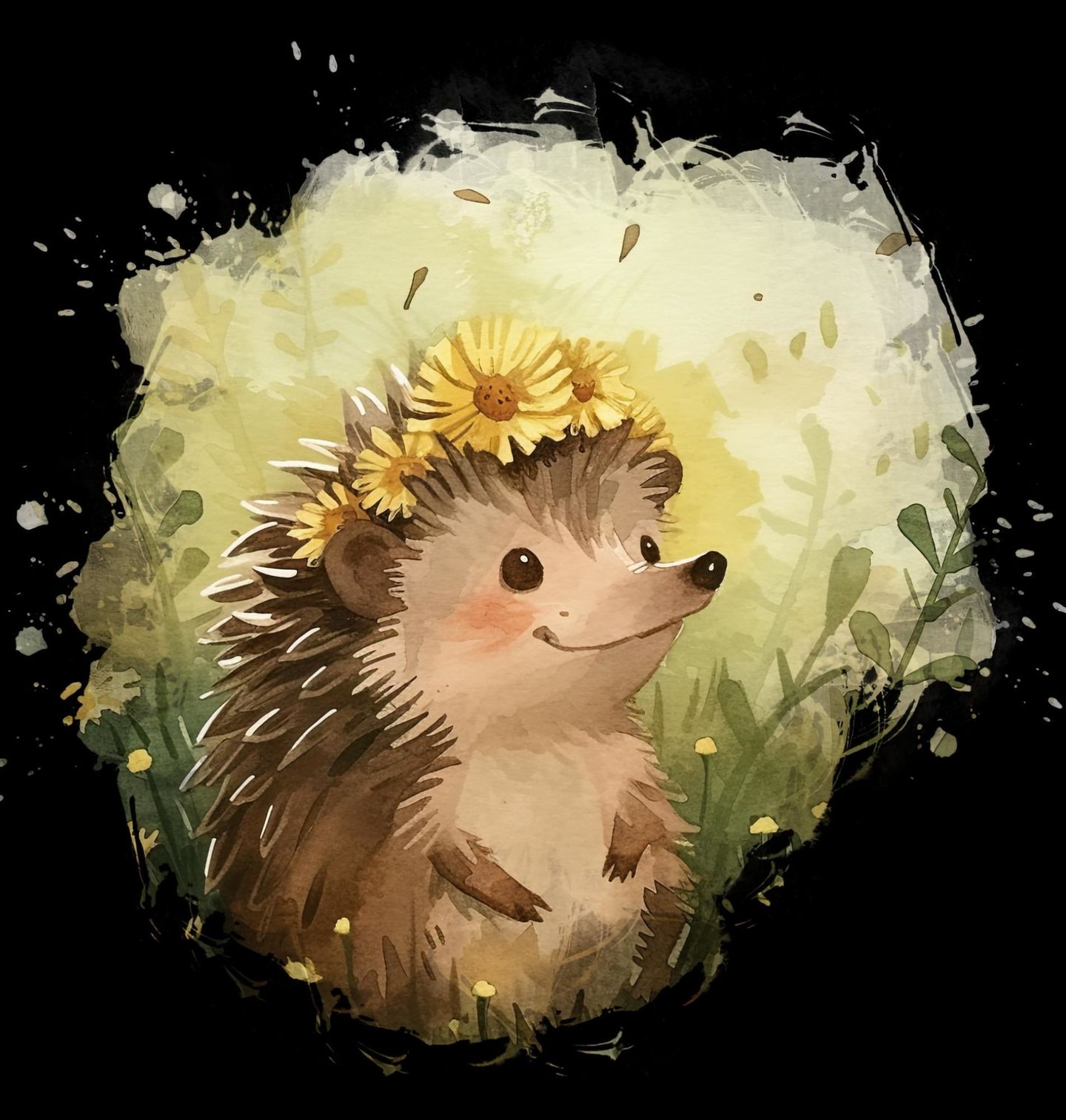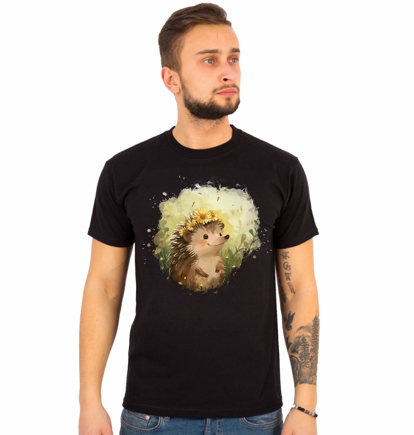 Pánské tričko Usměvavý Ježek v Květinách. Tento něžný ilustrativní motiv zachycuje roztomilého ježka, který stojí v trávě a na hlavě má věneček ze žlutých květiny. Jemný akvarelový styl, měkké barvy a laskavý výraz ježka vytvářejí pocit klidu, radosti a pohádkové atmosféry. Ježek symbolizuje nevinnost, bezpečí a laskavost, zatímco květiny dodávají obrázku svěžest, lehkost a jarní náladu.