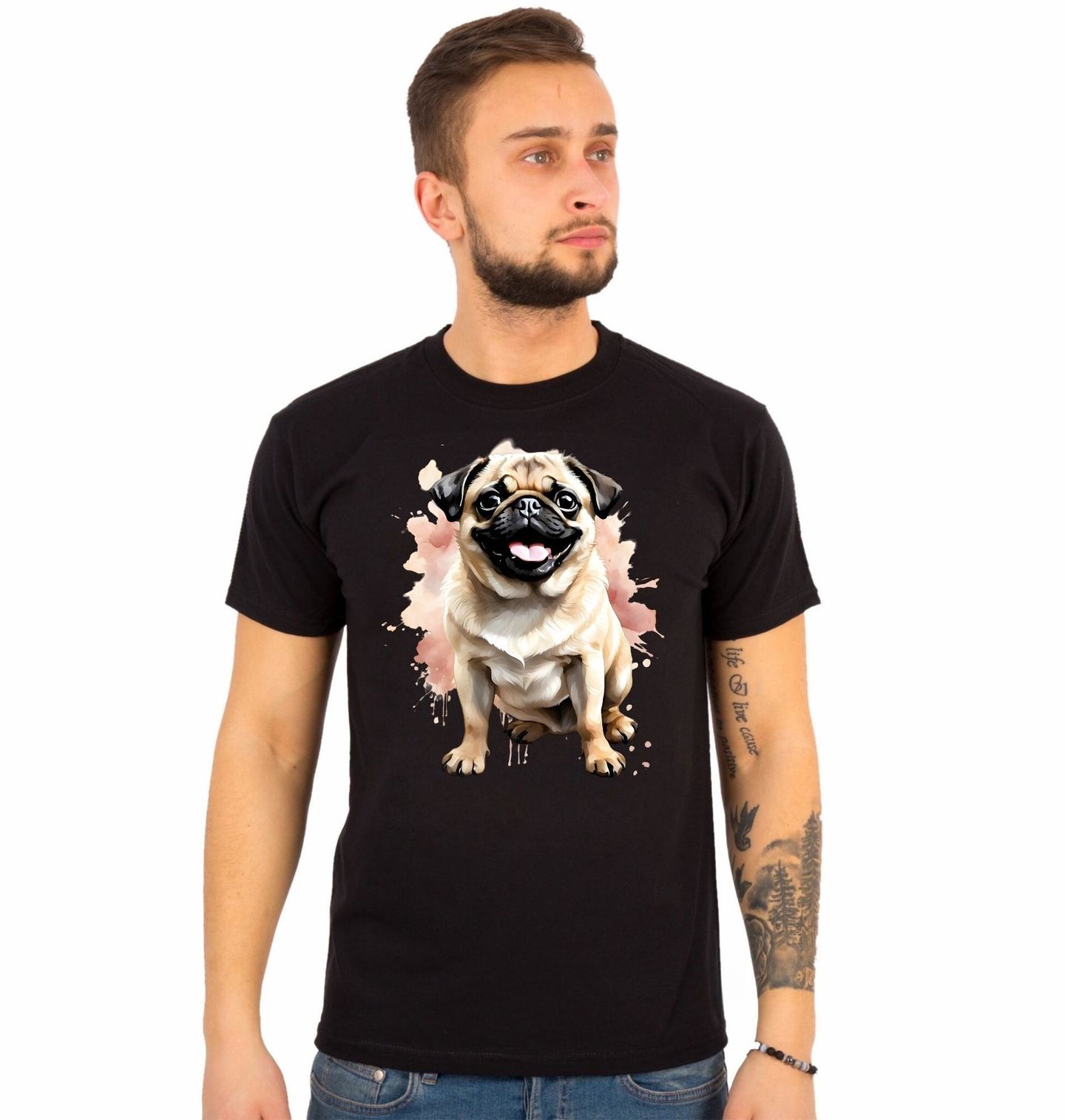 Pánské tričko Usměvavý Mops. Stylový a veselý motiv, který potěší každého milovníka psů. Tento roztomilý pes s velkýma očima a typickým výrazem okamžitě vykouzlí úsměv na tváři každého pejskař. Jemné barevné pozadí dodává ilustraci moderní a zároveň hravý vzhled. Na obrázku je mops (pug) – oblíbené plemeno známé svou přátelskou povahou, hravostí a typickým „usměvavým“ výrazem.