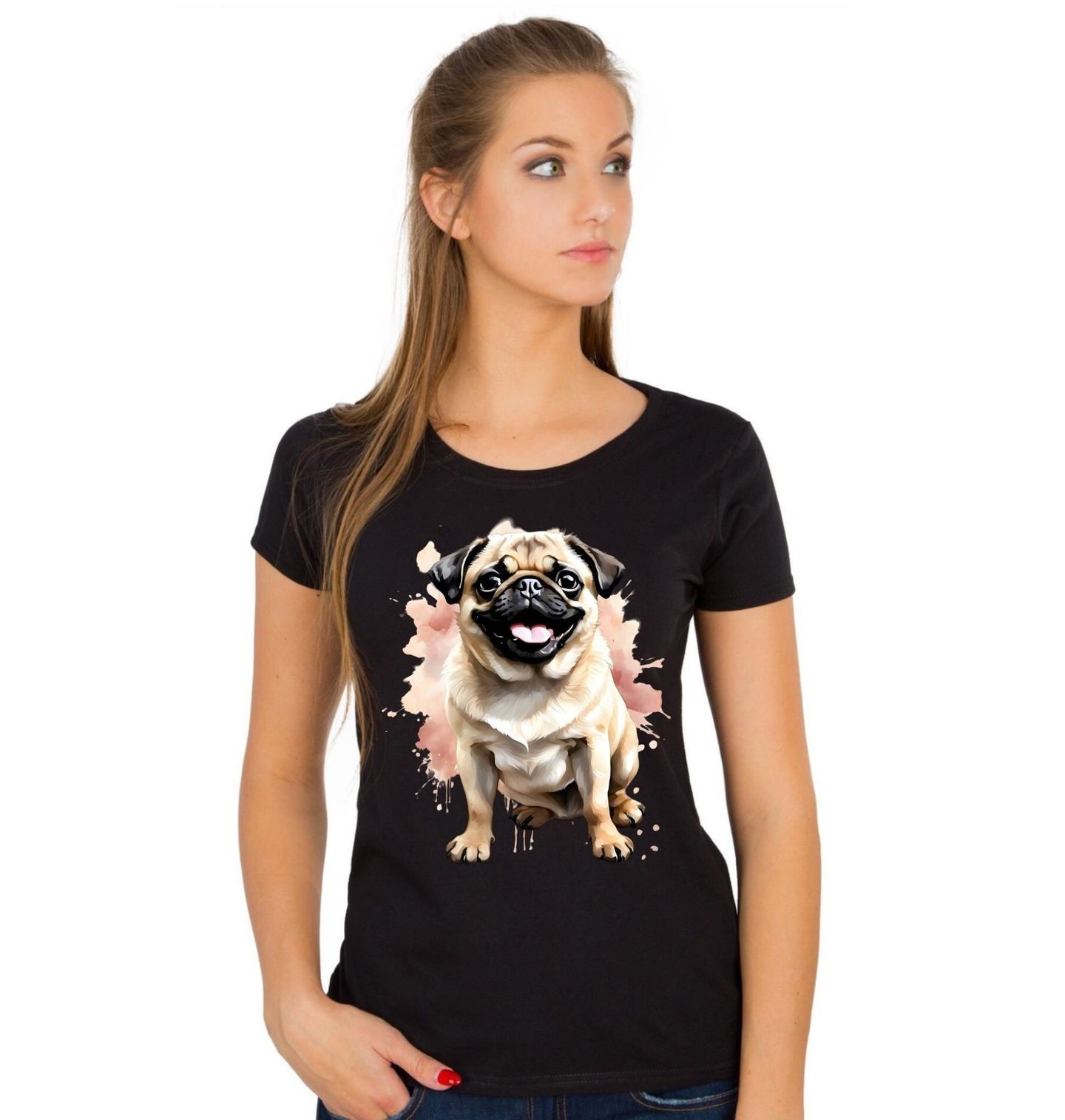 Dámské tričko Usměvavý Mops. Stylový a veselý motiv, který potěší každého milovníka psů. Tento roztomilý pes s velkýma očima a typickým výrazem okamžitě vykouzlí úsměv na tváři každého pejskař. Jemné barevné pozadí dodává ilustraci moderní a zároveň hravý vzhled. Na obrázku je mops (pug) – oblíbené plemeno známé svou přátelskou povahou, hravostí a typickým „usměvavým“ výrazem.