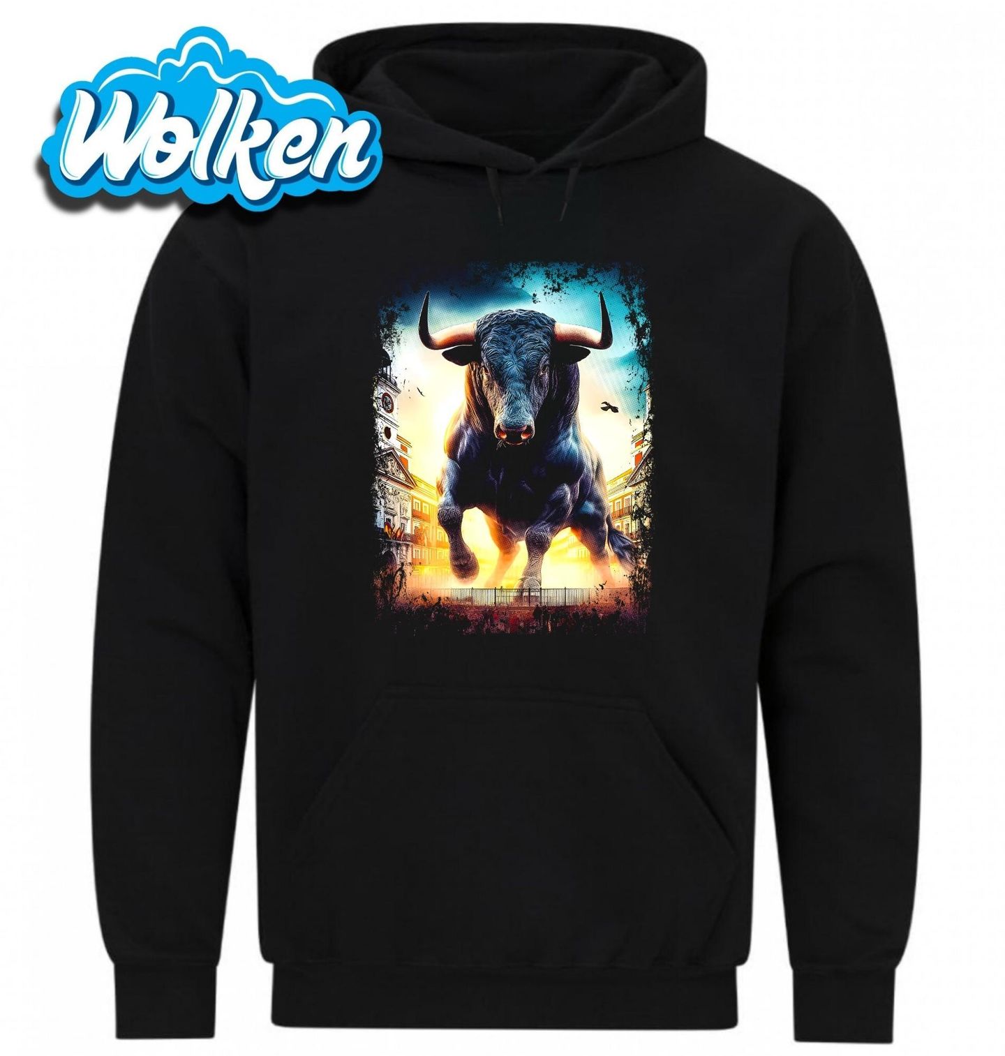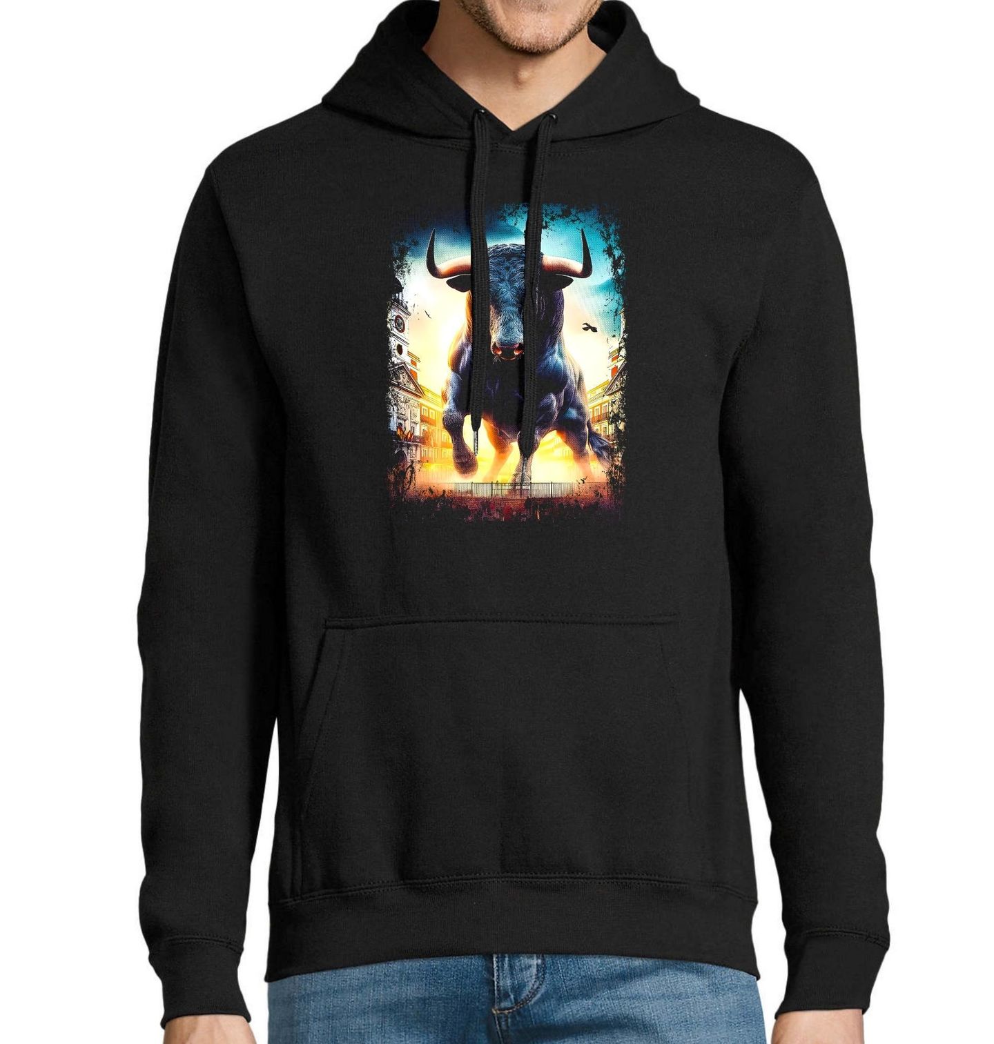 Pánská mikina Útok Býka ve Městě. Vstup do světa adrenalinu s tímto jedinečným tričkem, na kterém dominuje mohutný býk v plném běhu městem. Symbol síly, odhodlání a nespoutané energie - motiv, který v sobě nese odkaz slavného běhu s býky. Toto tričko je ideální volbou pro každého, kdo chce nosit odvážný a výrazný motiv s prvkem divokosti a respektu.