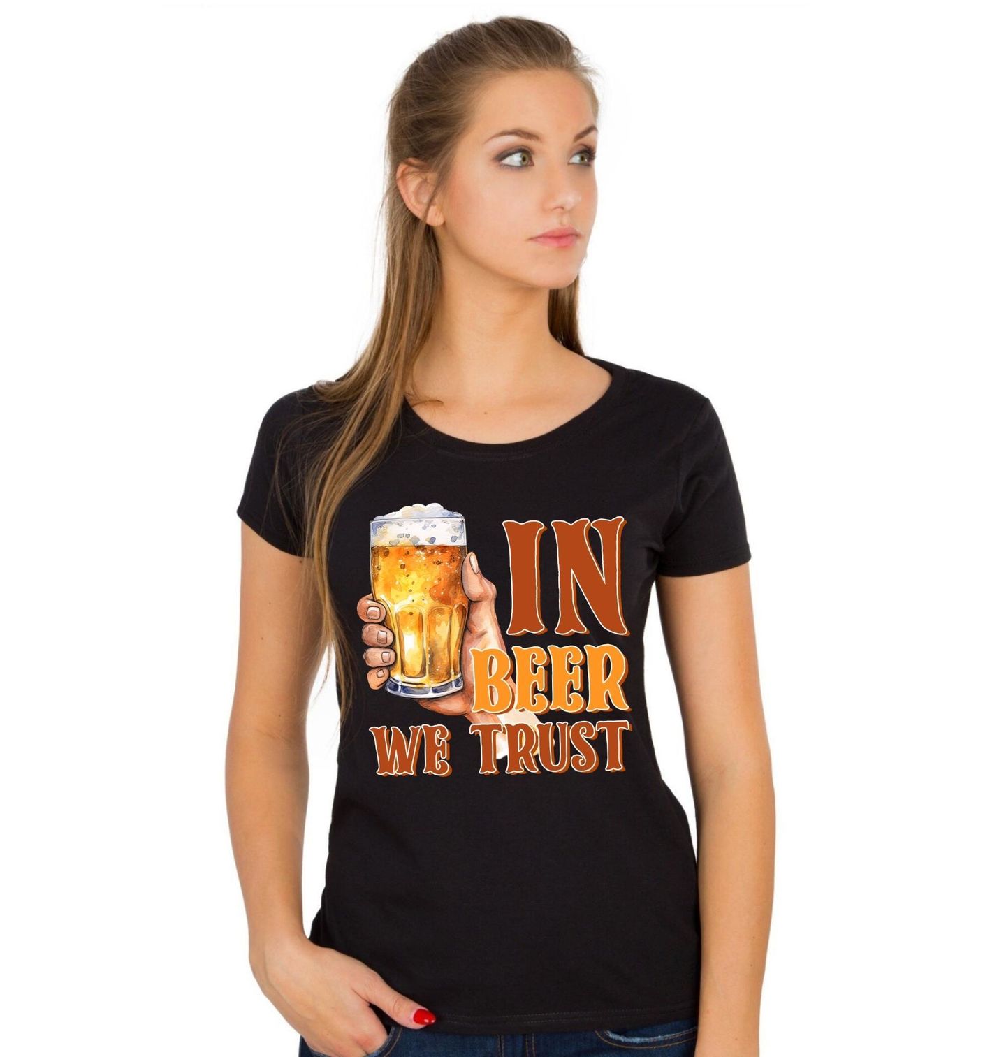 Dámské tričko V pivo věříme In Beer We Trust. Originální motiv pro každého, kdo ví, že pivo je životní styl. Design zobrazuje ruku držící orosený půllitr a výrazný nápis „In Beer We Trust“, což v překladu znamená „V pivo věříme“ – vtipná slovní hříčka inspirovaná známým heslem „In God We Trust“. Tento motiv je ideální pro fanoušky hospodské pohody, festivalů i přátelských posezení, kde pivo hraje hlavní roli.