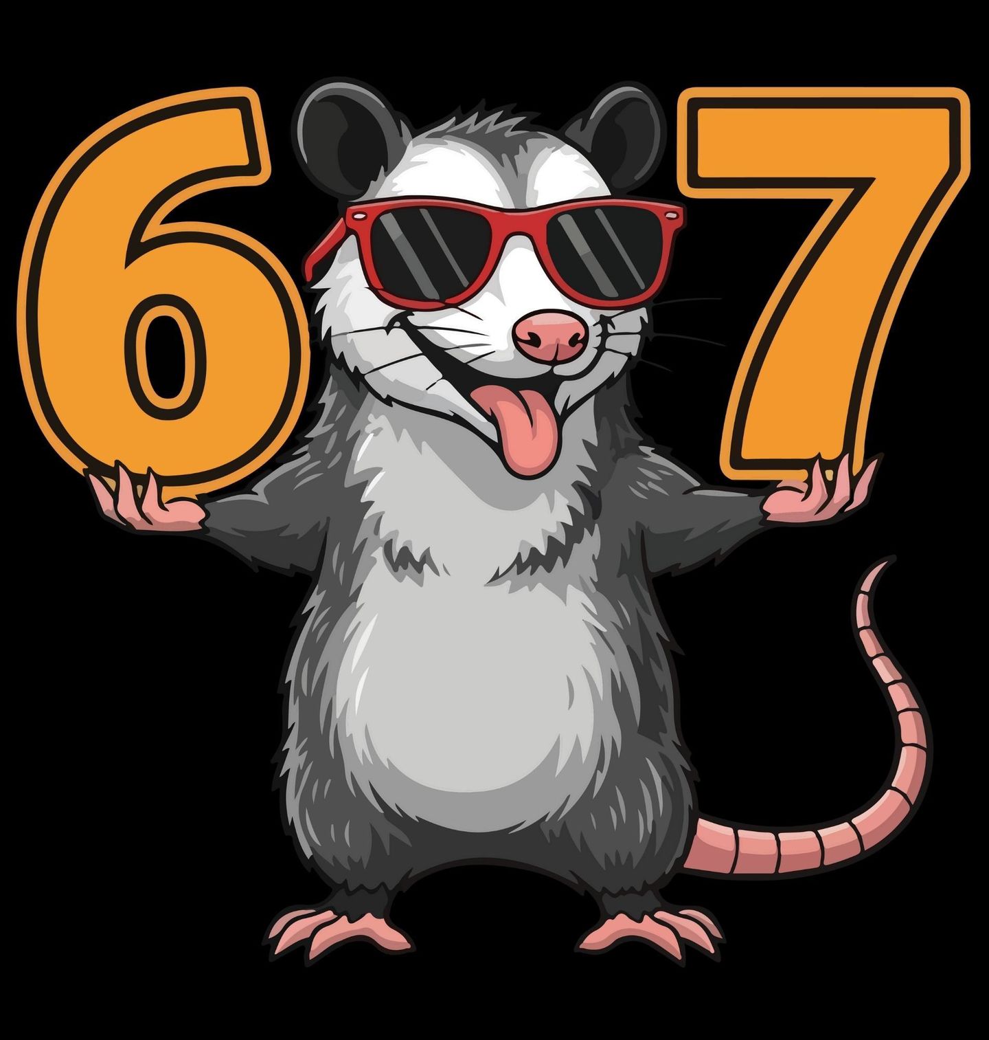 Pánské tričko Vačice v Brýlích 67 Six Seven. Veselá vačice v slunečních brýlích drží velká oranžová čísla 67 a dává jasně najevo, že six seven meme může mít i pořádně „cool“ podobu. Hrátky s čísly, pohoda a vtipná ilustrace dělají z tohoto designu skvělou volbu pro děti i dospělé, kteří chtějí něco netradičního.