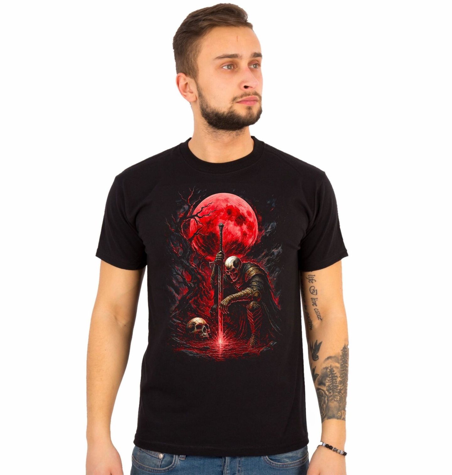 Pánské tričko Válečný Kostlivec při Krvavém Měsíci. Temný a epický motiv, který zachycuje okamžik klidu uprostřed chaosu. Dominantní kostlivec klečí s mečem pod rudým nebem, kde září děsivý měsíc a osvětluje scénu plnou symboliky a síly. Atmosféra tajemství, ticha a napětí vytváří silný vizuální příběh. Pokud hledáte originální motiv, kde kostlivec pod krvavým měsícem symbolizuje sílu, klid i osud, tento design vás zaujme na první pohled.