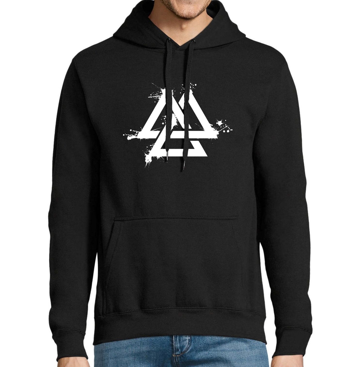 Pánská mikina Valknut Uzel Padlých Válečníků. Valknut je tvořen třemi propojenými trojúhelníky a pochází ze severské mytologie. Je spojován s bohem Odinem, strážcem padlých válečníků ve Valhalle. Tento symbol se nacházel na runových kamenech i pohřebních artefaktech a symbolizuje přechod mezi světy – životem a smrtí.