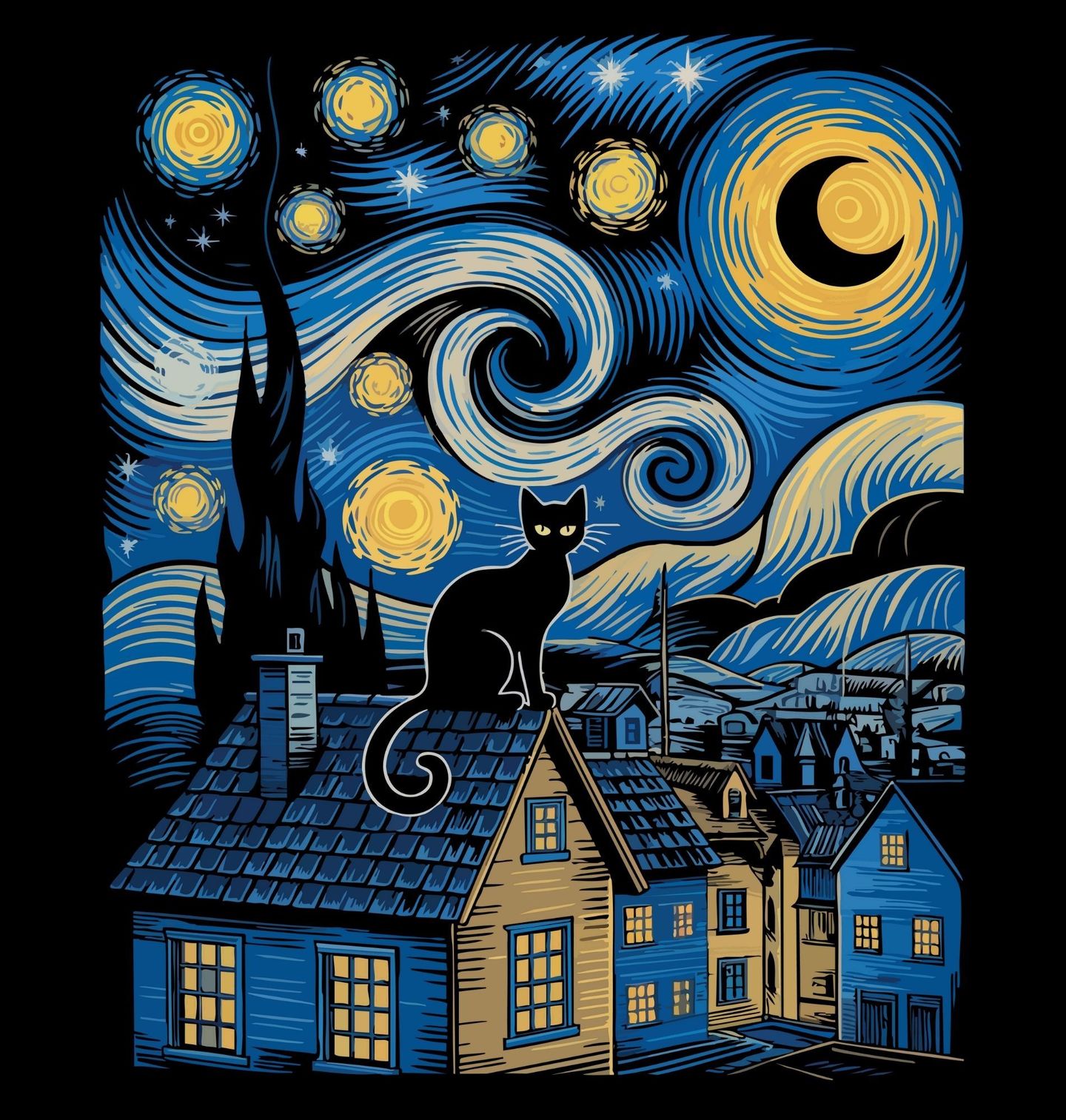 Dámské tričko Van Goghova Kočka na Střeše. Spojení umění a tajemna – přesně tím je tento originální motiv kočky sedící na střeše pod ikonickou oblohou inspirovanou slavným obrazem Hvězdná noc od Vincenta van Gogha. Elegantní kočka ve stínu měsíčního svitu dokonale ladí s dramatickým nočním nebem plným vířících hvězd.
