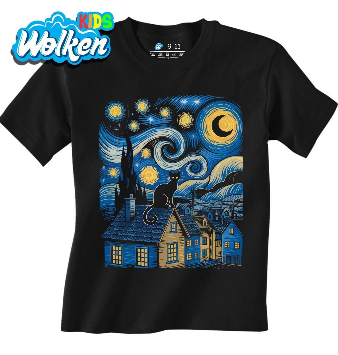 Dětské tričko Van Goghova Kočka na Střeše. Spojení umění a tajemna – přesně tím je tento originální motiv kočky sedící na střeše pod ikonickou oblohou inspirovanou slavným obrazem Hvězdná noc od Vincenta van Gogha. Elegantní kočka ve stínu měsíčního svitu dokonale ladí s dramatickým nočním nebem plným vířících hvězd.