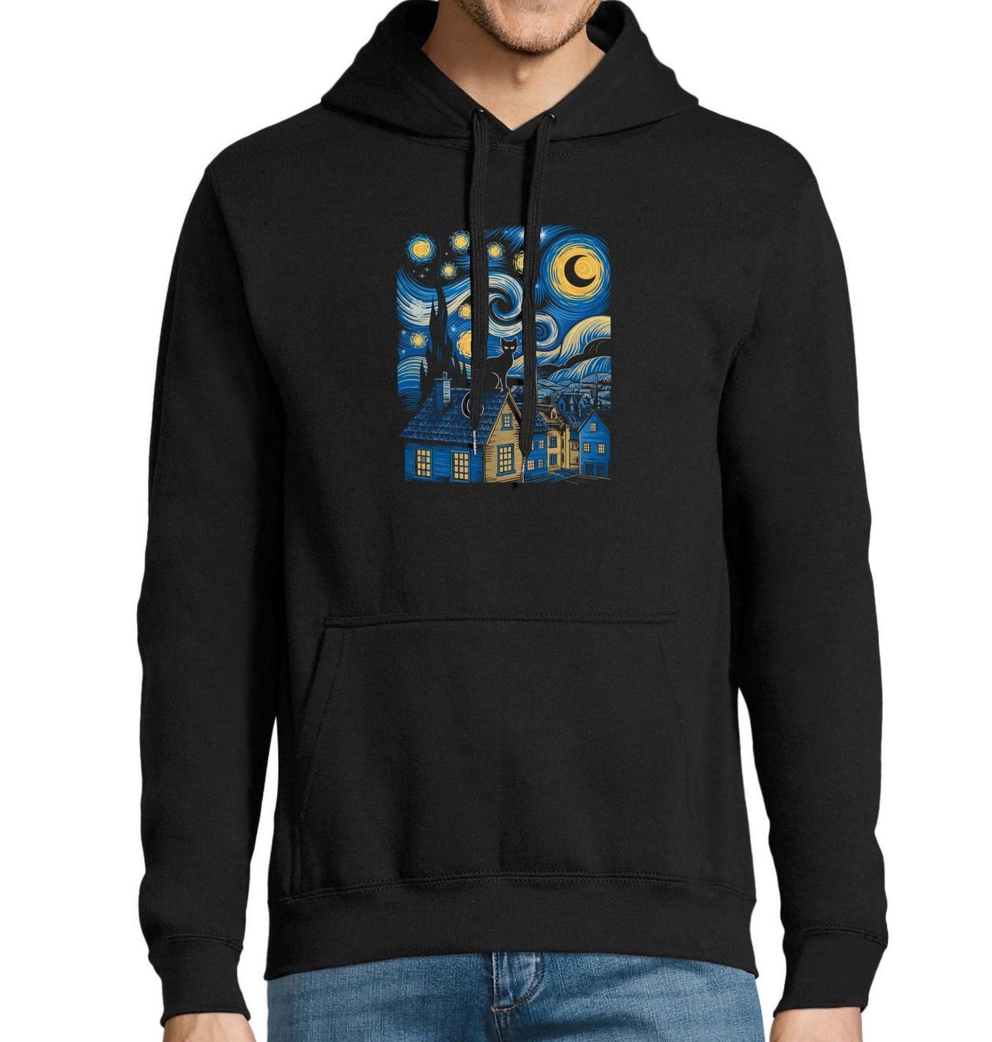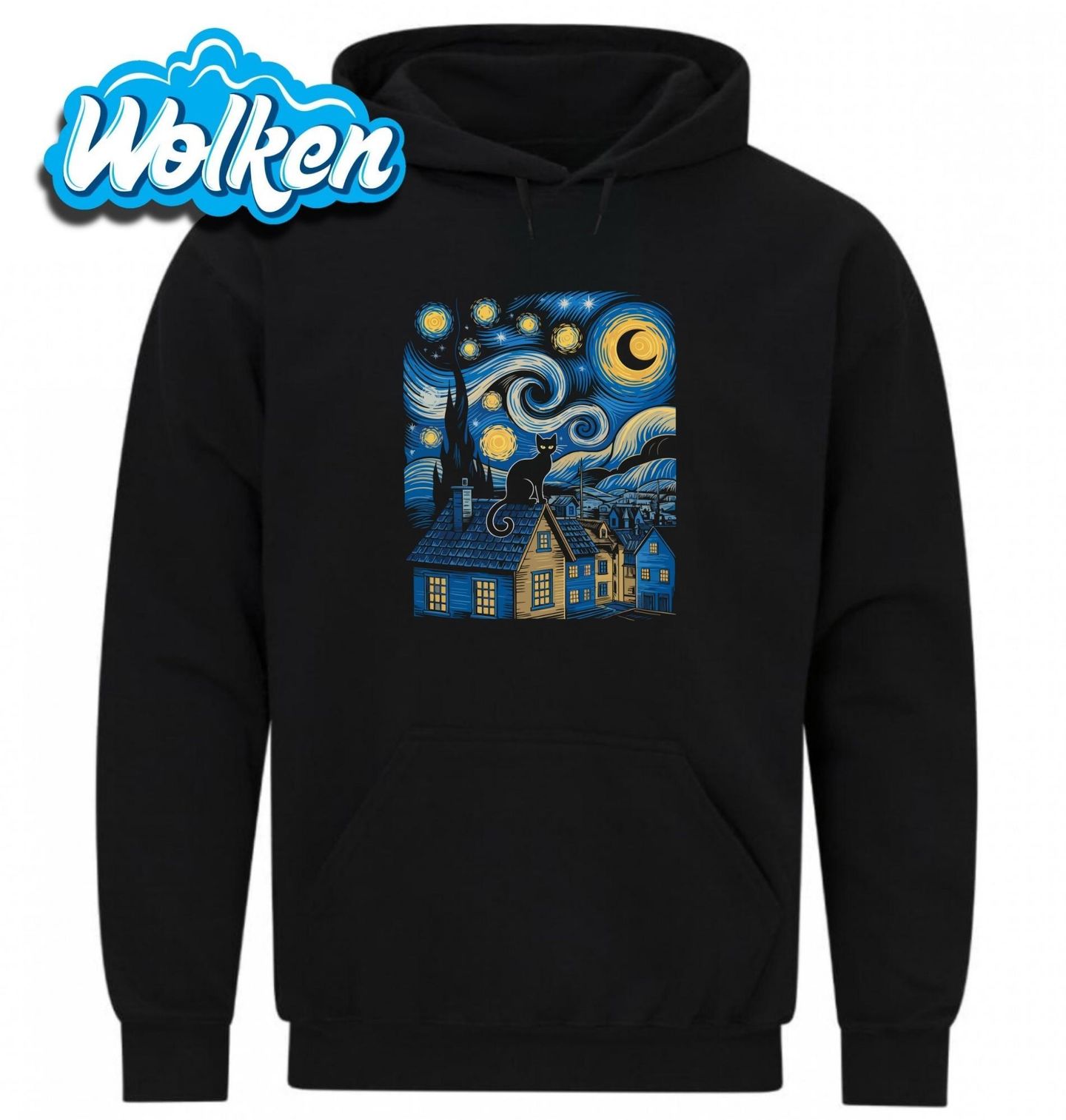 Pánská mikina Van Goghova Kočka na Střeše. Spojení umění a tajemna – přesně tím je tento originální motiv kočky sedící na střeše pod ikonickou oblohou inspirovanou slavným obrazem Hvězdná noc od Vincenta van Gogha. Elegantní kočka ve stínu měsíčního svitu dokonale ladí s dramatickým nočním nebem plným vířících hvězd.