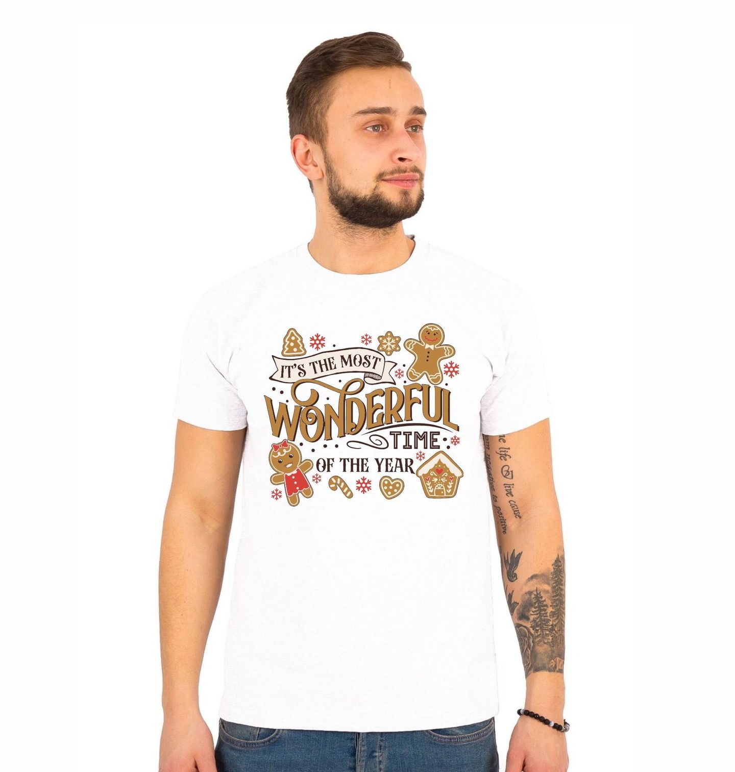 Pánské tričko Vánoce jsou ten nejkrásnější čas v roce. „It’s the most wonderful time of the year“ - Vánoce jsou ten nejkrásnější čas v roce – a co by to bylo za Vánoce bez perníčků, cukroví a roztomilých dekorací? Tento hravý motiv spojuje všechno, co máme na Vánocích rádi: veselou perníčkovou rodinu, sladké detaily.