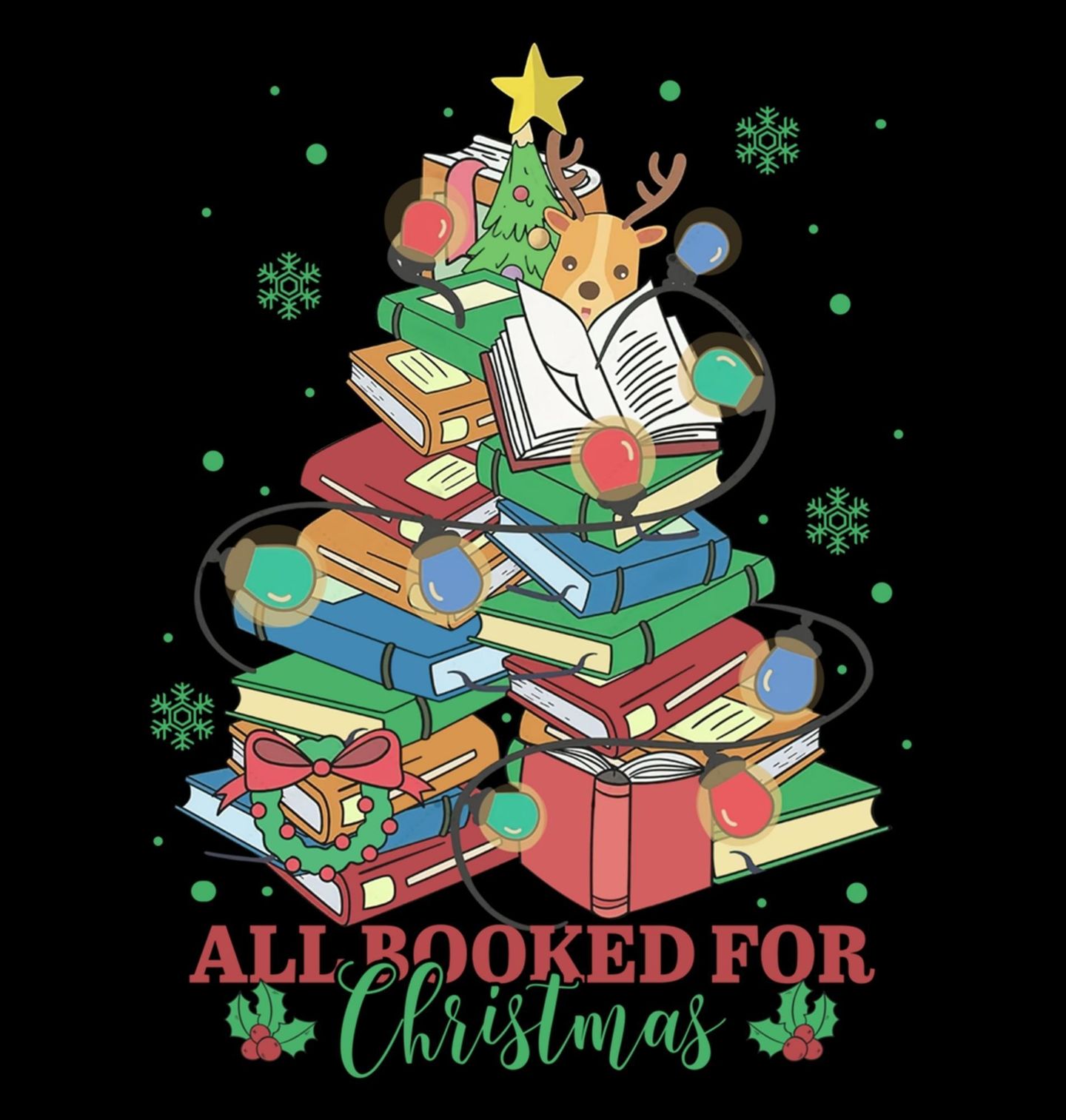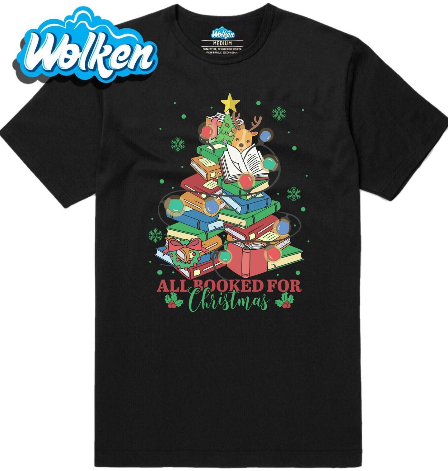 Pánské tričko Vánoce mezi Knihami. Pak je tenhle motiv přesně pro vás! Vtipný a roztomilý design s nápisem „All Booked for Christmas“ (volně přeloženo jako „Na Vánoce úplně zabookováno knihami“) znázorňuje vánoční stromeček a knihy, ozdobený světýlky, sobem a věncem.