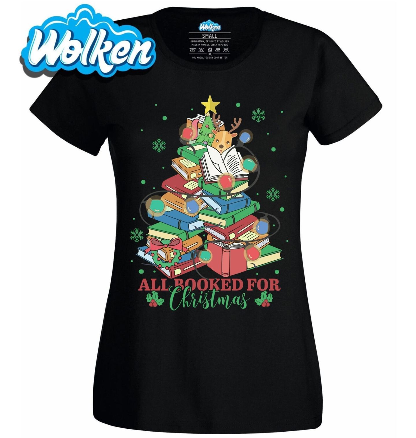 Dámské tričko Vánoce mezi Knihami. Pak je tenhle motiv přesně pro vás! Vtipný a roztomilý design s nápisem „All Booked for Christmas“ (volně přeloženo jako „Na Vánoce úplně zabookováno knihami“) znázorňuje vánoční stromeček a knihy, ozdobený světýlky, sobem a věncem.