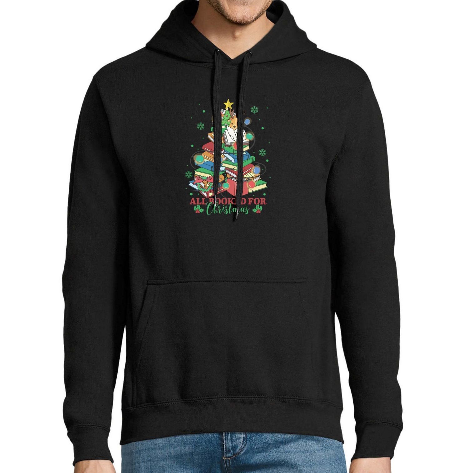 Pánská mikina Vánoce mezi Knihami. Pak je tenhle motiv přesně pro vás! Vtipný a roztomilý design s nápisem „All Booked for Christmas“ (volně přeloženo jako „Na Vánoce úplně zabookováno knihami“) znázorňuje vánoční stromeček a knihy, ozdobený světýlky, sobem a věncem.