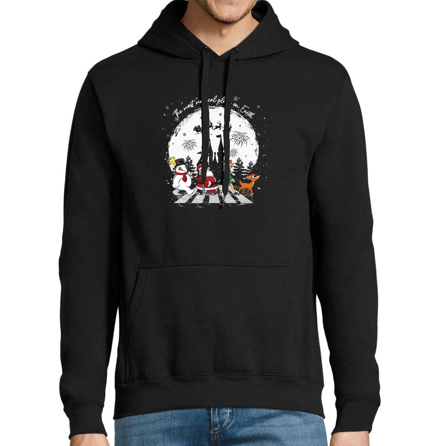 Pánská mikina Vánoce na Abbey Road Beatles. Tento zábavný motiv představuje vánoční verzi ikonického přechodu slavné skupiny The Beatles z jejich kultovního alba „Abbey Road“. Motiv zobrazuje slavné vánoční postavičky – sněhuláka, Santa Clause, elfa a soba Rudolfa. „The most magical place on Earth“ – Nejkouzelnější místo na Zemi.
