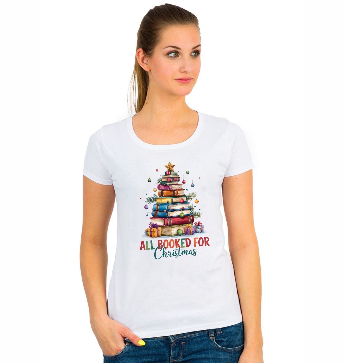 Dámské tričko Vánoce s Knihami All Booked for Christmas. Kouzelný motiv „All Booked for Christmas“ je pro všechny knihomoly a milovníky čtení! Vánoční stromeček poskládaný z barevných knih s ozdobami a dárky potěší každého, kdo miluje čtení a klidné Vánoce strávené se svou oblíbenou knížkou.