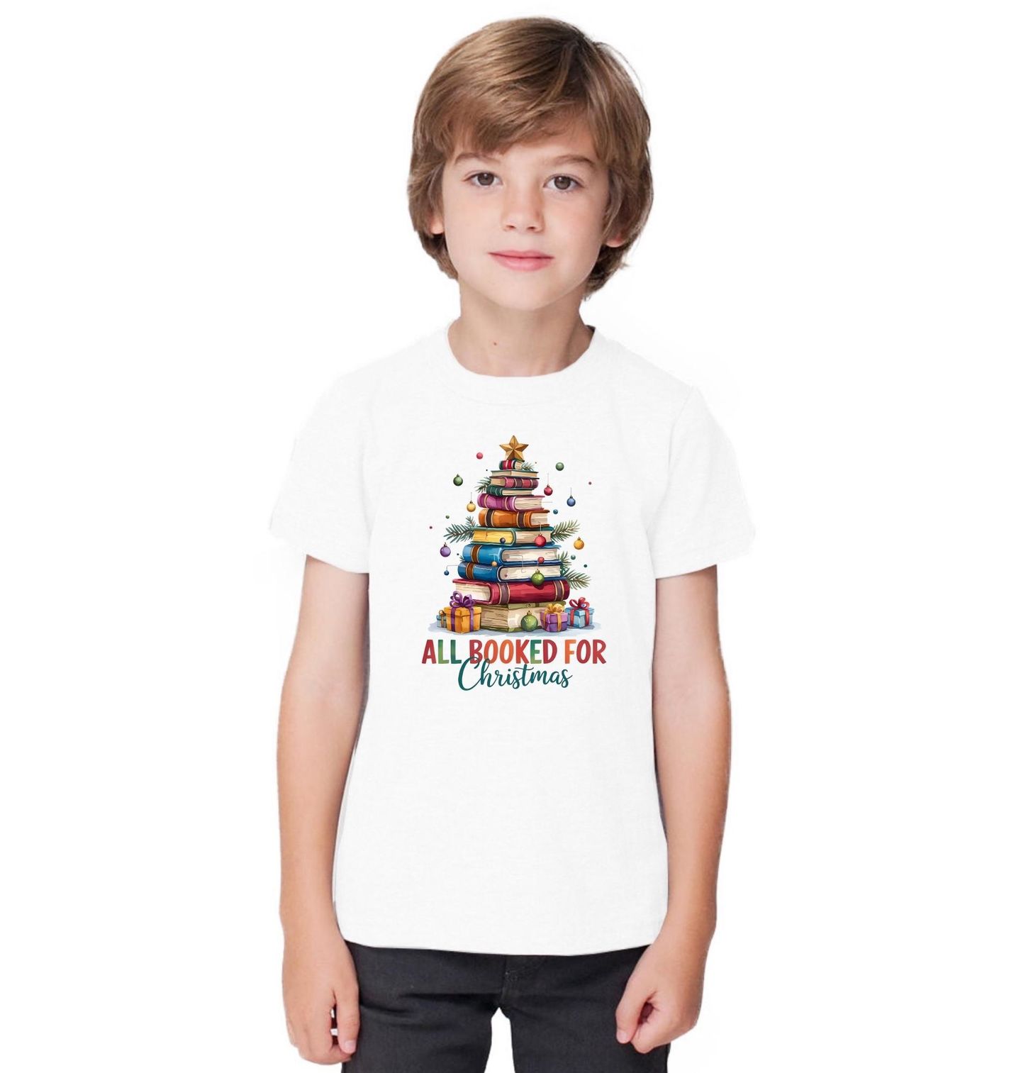 Dětské tričko Vánoce s Knihami All Booked for Christmas. Kouzelný motiv „All Booked for Christmas“ je pro všechny knihomoly a milovníky čtení! Vánoční stromeček poskládaný z barevných knih s ozdobami a dárky potěší každého, kdo miluje čtení a klidné Vánoce strávené se svou oblíbenou knížkou.