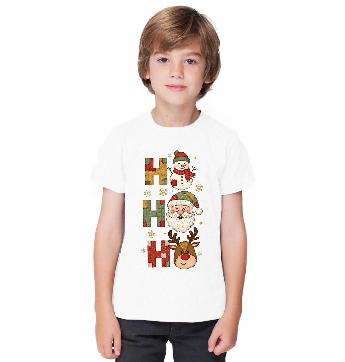 Dětské tričko Vánoce se Záplatou Ho Ho Ho. Design zobrazuje tradiční vánoční výjev „Ho Ho Ho“, kde každé písmeno H je tvořeno stylizovanou látkovou záplatou, typickou pro patchwork. Mezi písmeny najdeme usměvavého sněhuláka, veselého Santa Clause a roztomilého soba Rudolfa.