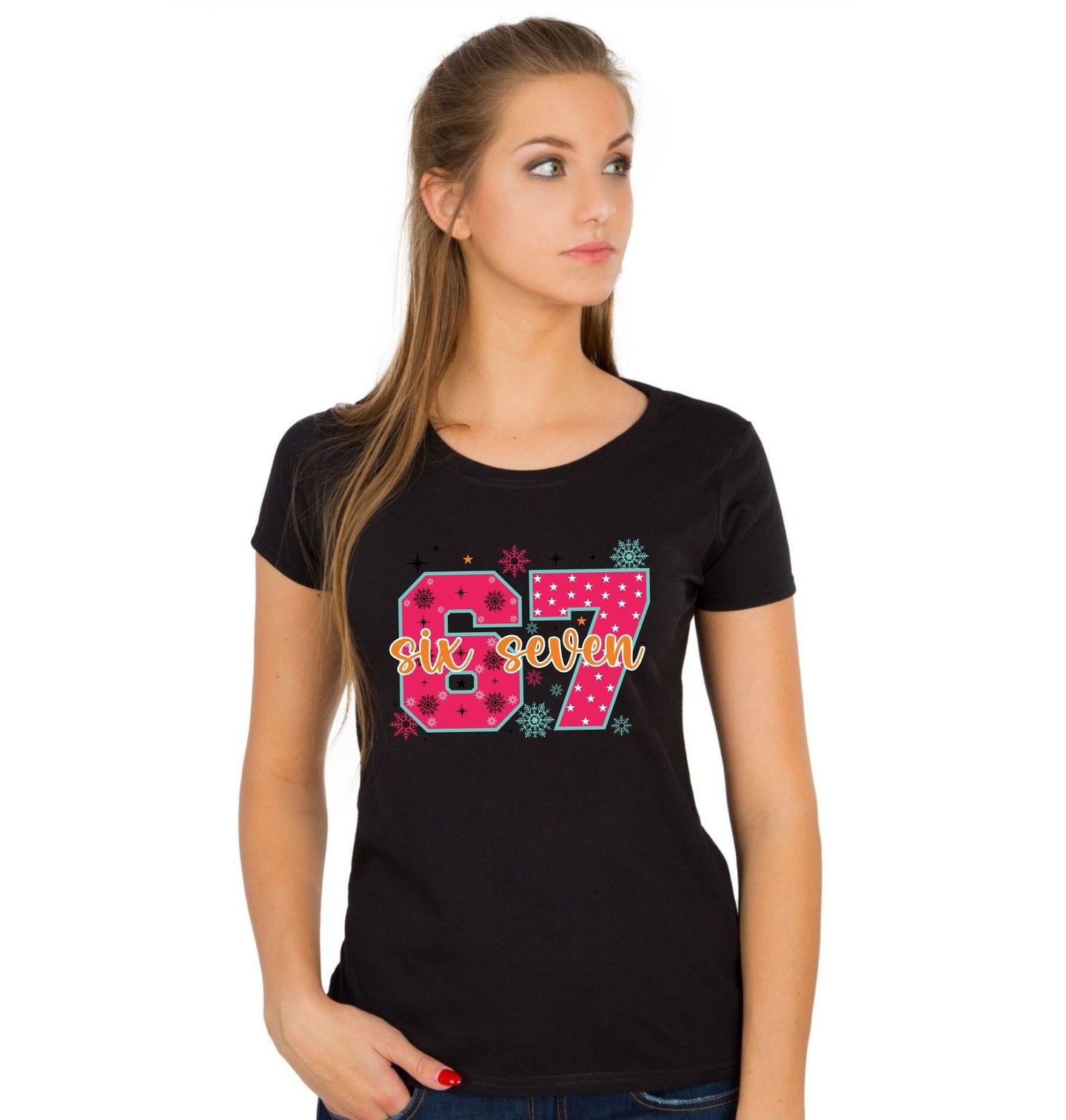 Dámské tričko Vánoční 67 Six Seven Meme. Na motivu je číslo 67 v růžové barvě, ozdobené vločkami a hvězdičkami ve vánočním stylu. Přes číslo je napsaný nápis six seven v dekorativním písmu. Kolem jsou další sněhové vločky a hvězdičky, díky čemuž působí celý design hravě a svátečně jako meme s na Vánoce.