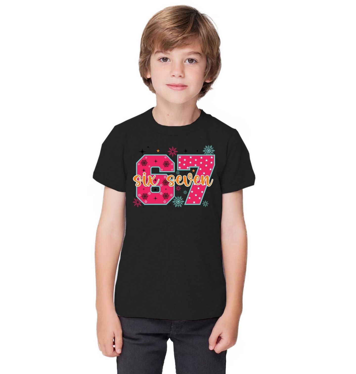 Dětské tričko Vánoční 67 Six Seven Meme. Na motivu je číslo 67 v růžové barvě, ozdobené vločkami a hvězdičkami ve vánočním stylu. Přes číslo je napsaný nápis six seven v dekorativním písmu. Kolem jsou další sněhové vločky a hvězdičky, díky čemuž působí celý design hravě a svátečně jako meme s na Vánoce.