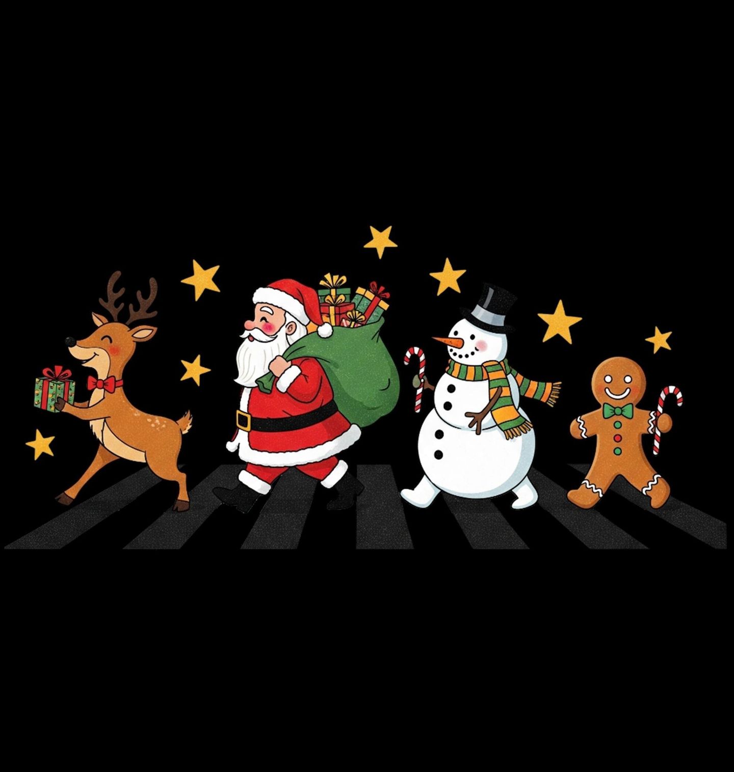 Pánské tričko Vánoční Abbey Road The Beatles. Vtipná a stylová vánoční parodie na slavný přechod Abbey Road! Místo rockové kapely zde kráčí čtveřice svátečních hrdinů – sob, Santa Claus, sněhulák a perníček – každý připravený rozzářit Vánoce dárky, sladkostmi a úsměvem. Originální design potěší fanoušky hudby, svátků i vtipných motivů.