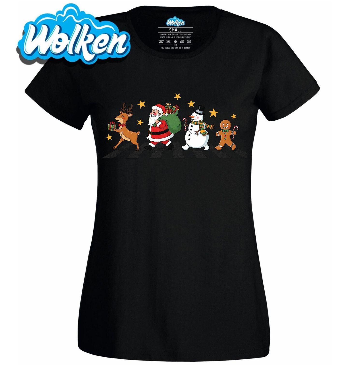 Dámské tričko Vánoční Abbey Road The Beatles. Vtipná a stylová vánoční parodie na slavný přechod Abbey Road! Místo rockové kapely zde kráčí čtveřice svátečních hrdinů – sob, Santa Claus, sněhulák a perníček – každý připravený rozzářit Vánoce dárky, sladkostmi a úsměvem. Originální design potěší fanoušky hudby, svátků i vtipných motivů.
