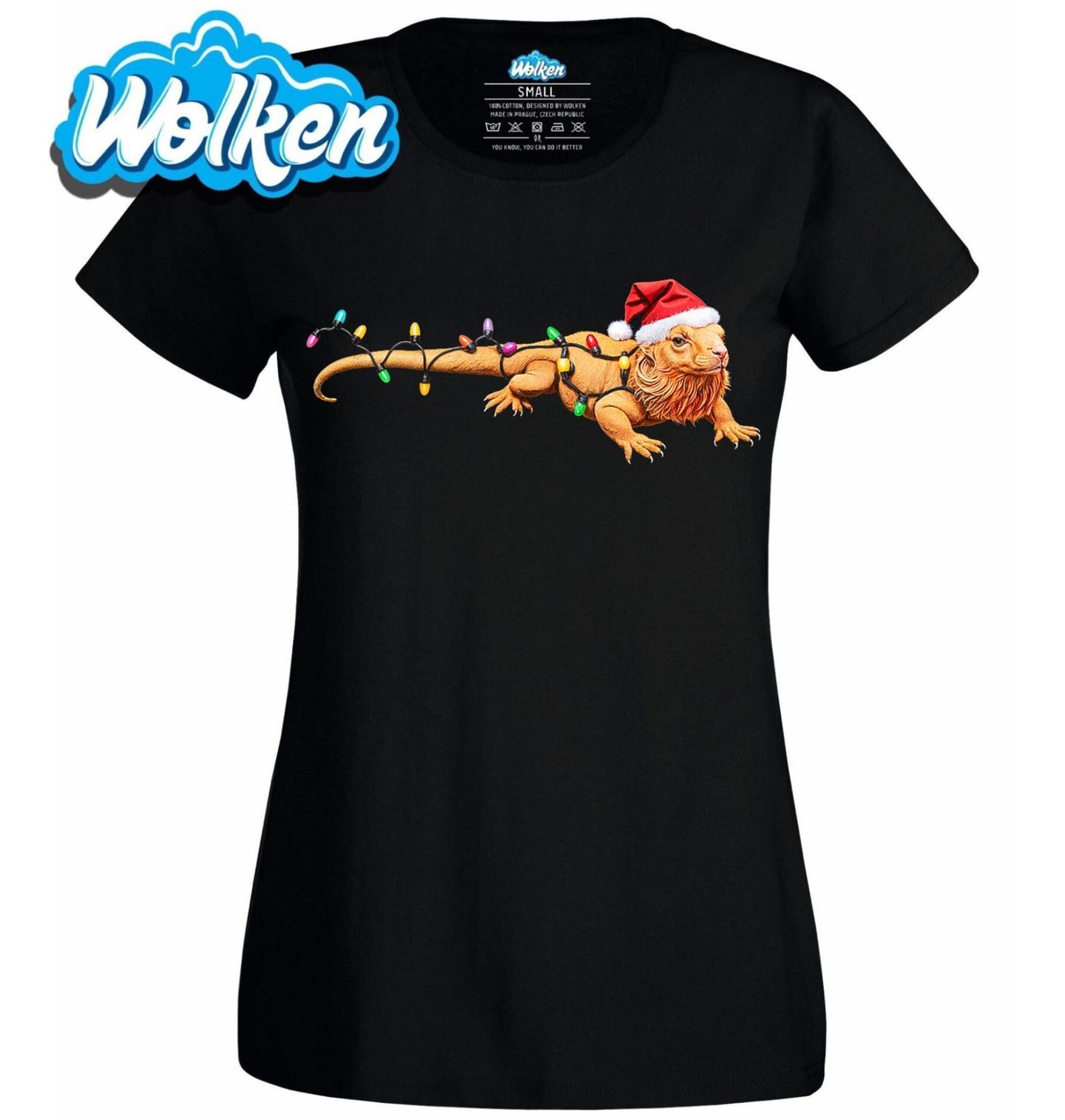 Dámské tričko Vánoční Agama Vousatá. Agama australská (Pogona vitticeps) je denní ještěr z čeledi agamovitých, jiným názvem agama vousatá. Užijte si Vánoce netradičně s motivem, na kterém je tento plaz v Santa čepici a zamotaný do barevných vánočních světýlek.