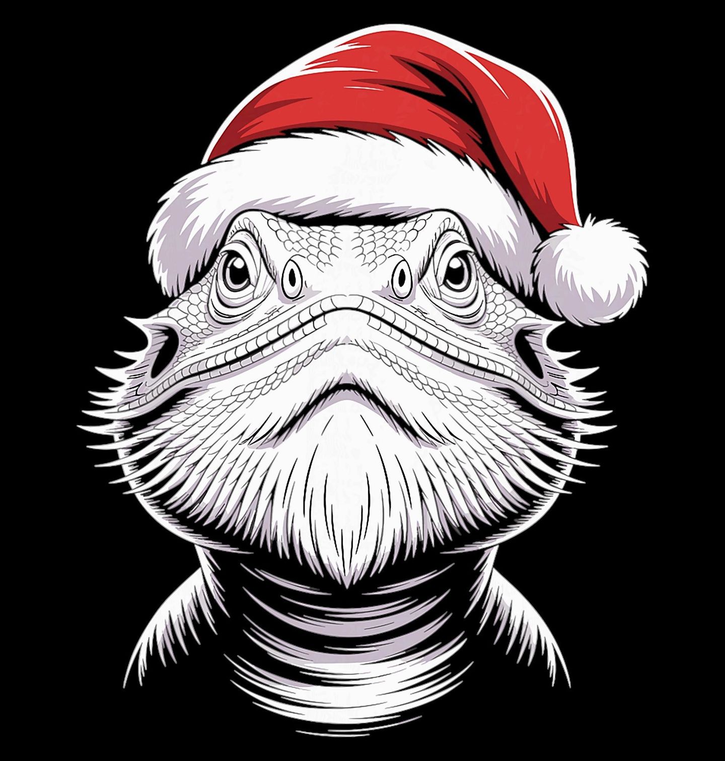Pánské tričko Vánoční Agama Vousatá v Čepici. Bearded Dragon je oblíbený ještěr známý svou klidnou povahou a charakteristickým „vouskem“. Stylová černobílá ilustrace agamy v Santa čepici je perfektním designem pro milovníky ještěrů, teraristiky a netradičních vánočních motivů. Tahle agama si Vánoce rozhodně nenechá ujít!