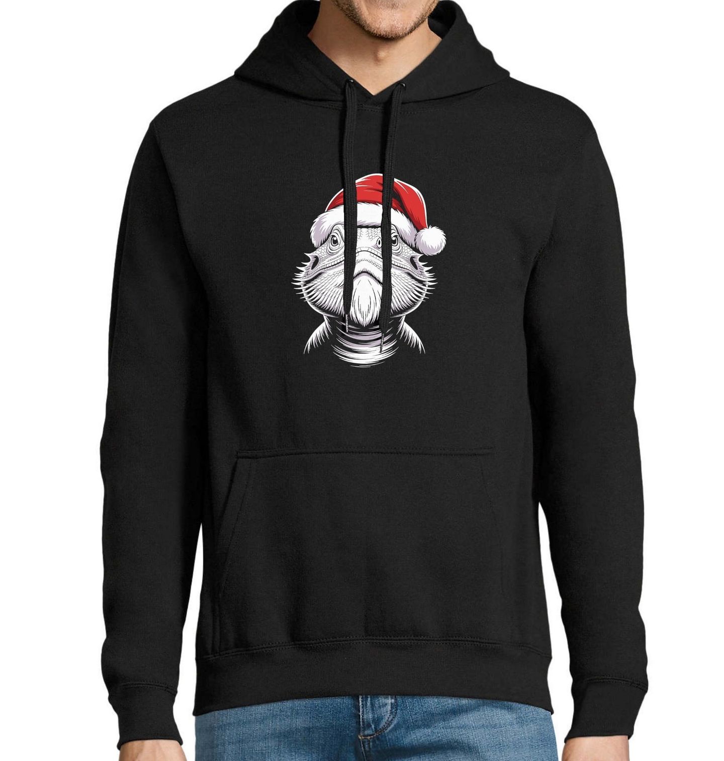 Pánská mikina Vánoční Agama Vousatá v Čepici. Bearded Dragon je oblíbený ještěr známý svou klidnou povahou a charakteristickým „vouskem“. Stylová černobílá ilustrace agamy v Santa čepici je perfektním designem pro milovníky ještěrů, teraristiky a netradičních vánočních motivů. Tahle agama si Vánoce rozhodně nenechá ujít!
