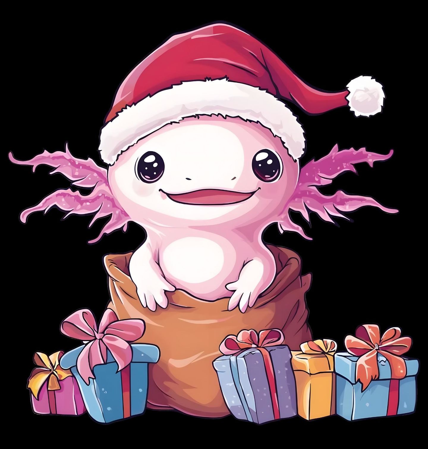 Dámské tričko Vánoční Axolotl v Pytli Dárků. Roztomilý axolotl s typickými růžovými žábrami vykukuje z vánočního pytle a rozdává radost! Má na hlavě santovskou čepici a je obklopený barevnými dárky s mašlemi – zkrátka ideální motiv, pokud hledáte něco originálního a trochu neobvyklého na Vánoce.