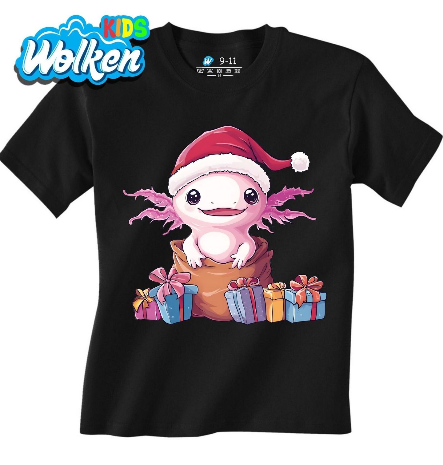 Dětské tričko Vánoční Axolotl v Pytli Dárků. Roztomilý axolotl s typickými růžovými žábrami vykukuje z vánočního pytle a rozdává radost! Má na hlavě santovskou čepici a je obklopený barevnými dárky s mašlemi – zkrátka ideální motiv, pokud hledáte něco originálního a trochu neobvyklého na Vánoce.