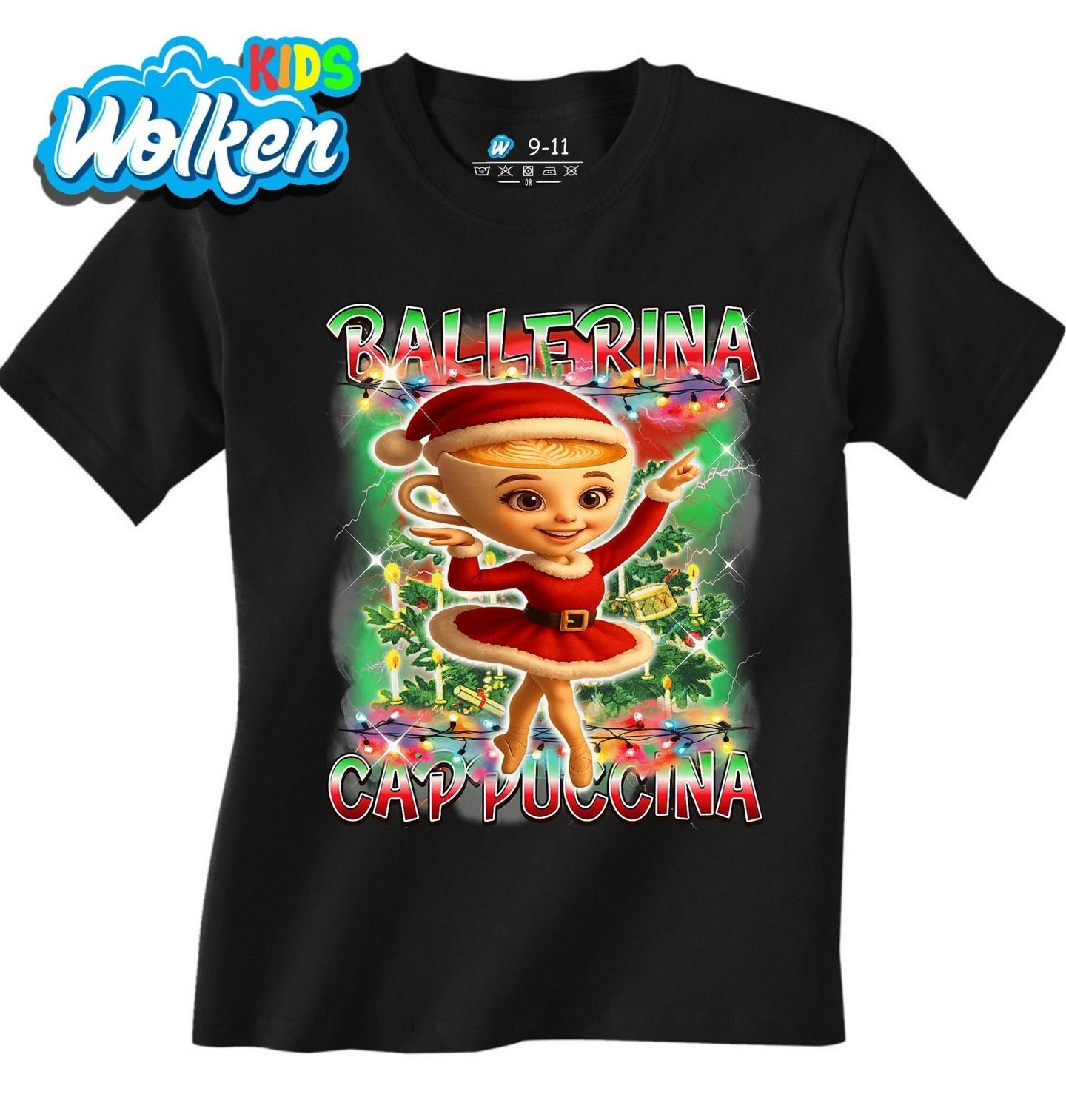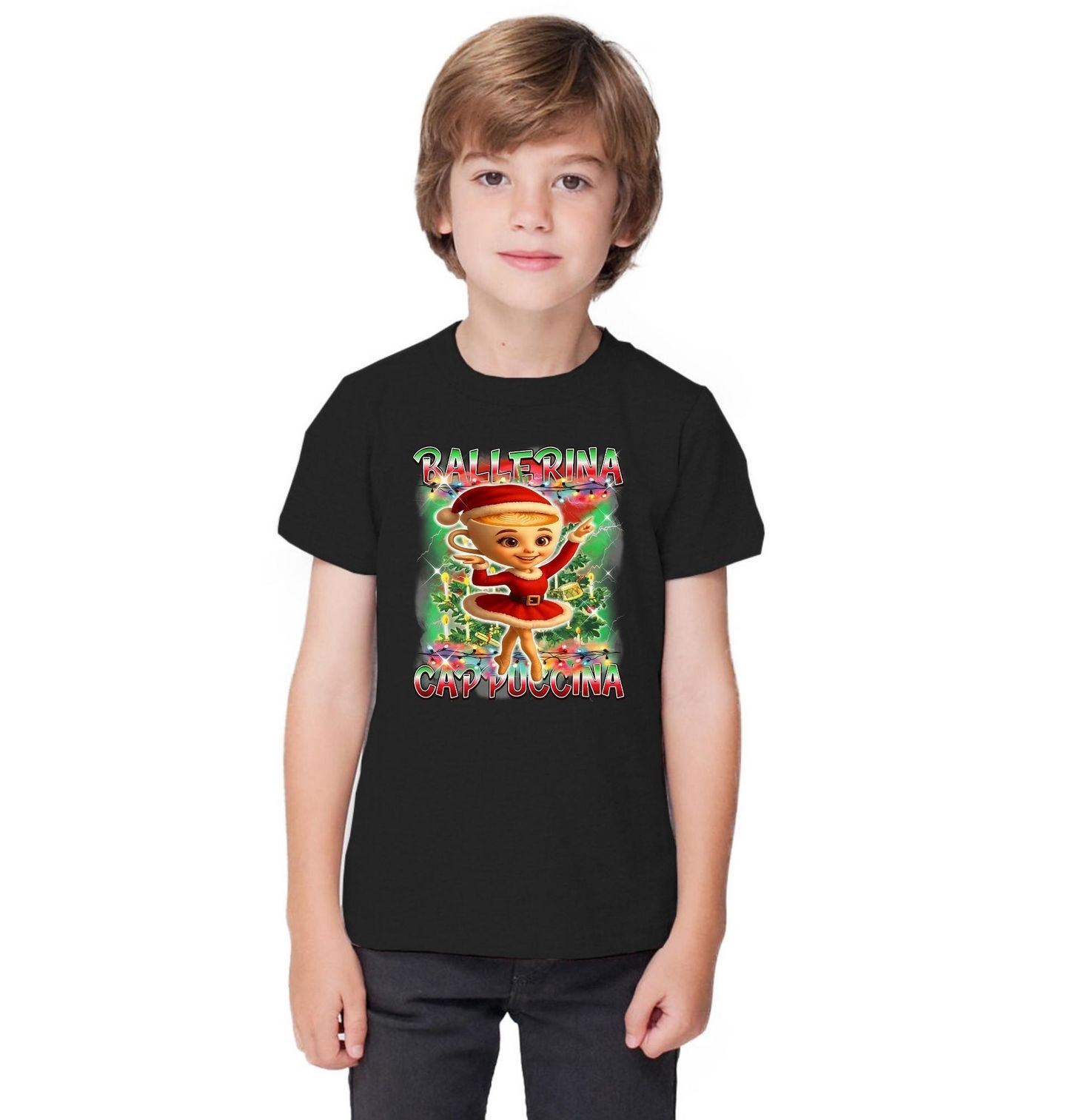 Dětské tričko Vánoční Ballerina Capuccina. Na obrázku je baletka v kostýmu Santa Clause, jejíž hlavu tvoří šálek s cappuccinem. Celý motiv je zasazený do prostředí plného vánočních světýlek a stromků, což dodává veselou a sváteční atmosféru. Perfektní pro ty co milují kávu, Vánoce a italský brainrot.
