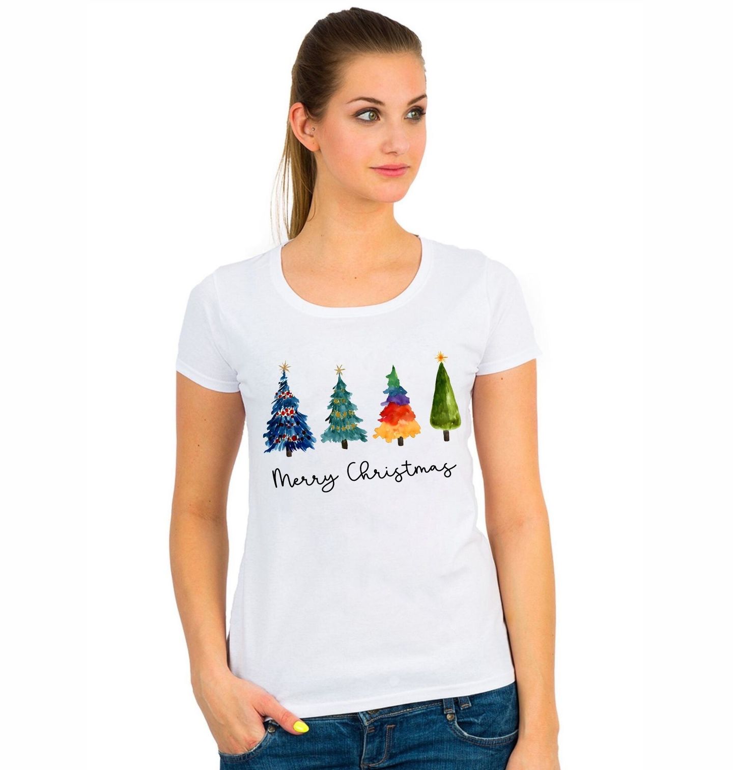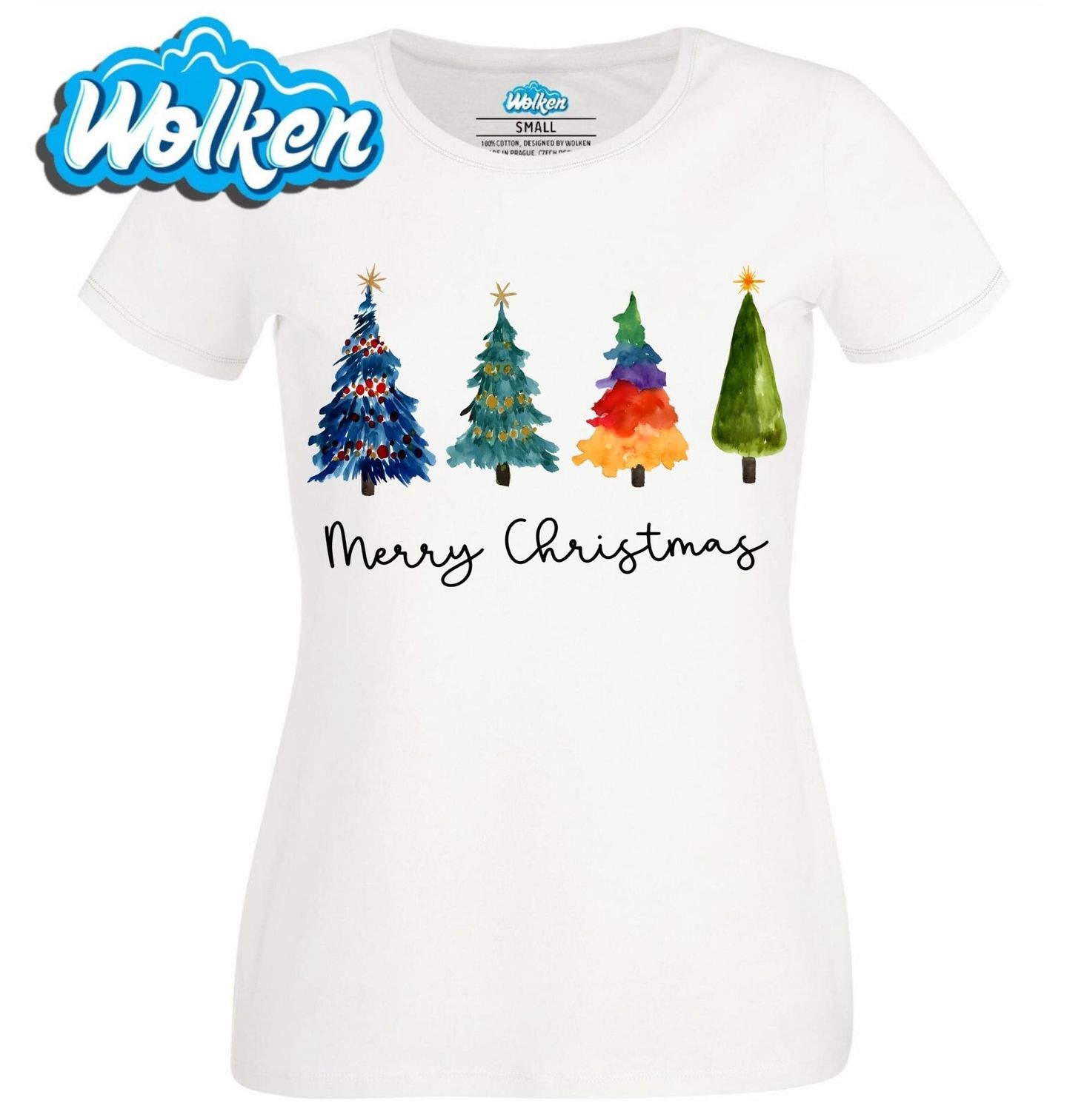 Dámské tričko Vánoční barevné stromky. Oslavte Vánoce stylově a s kapkou umění! Tento akvarelový motiv se čtyřmi originálně malovanými vánočními stromečky a nápisem „Merry Christmas“ potěší každého milovníka minimalistického designu a ručně malovaného stylu.