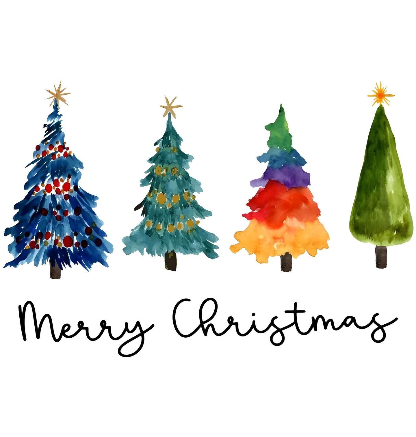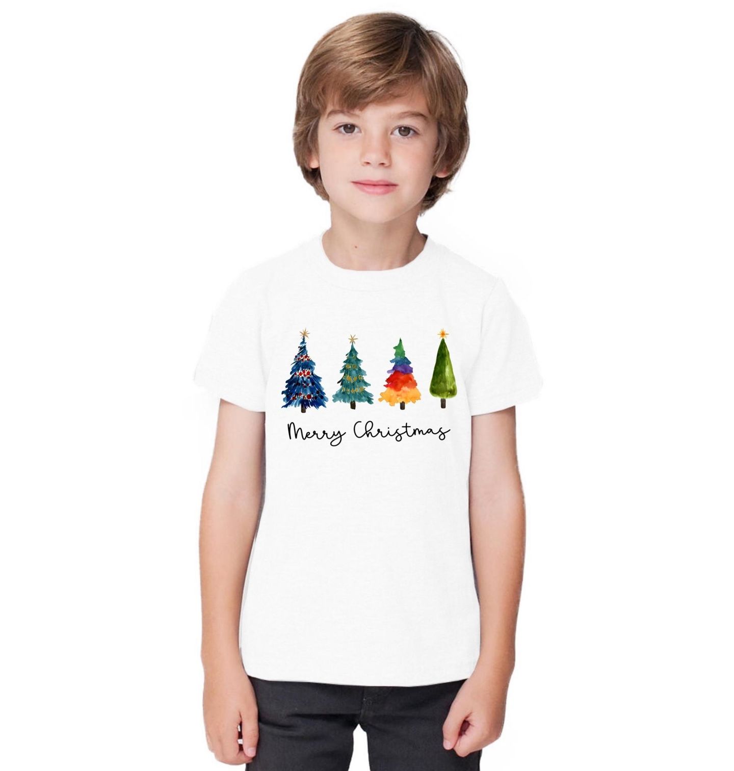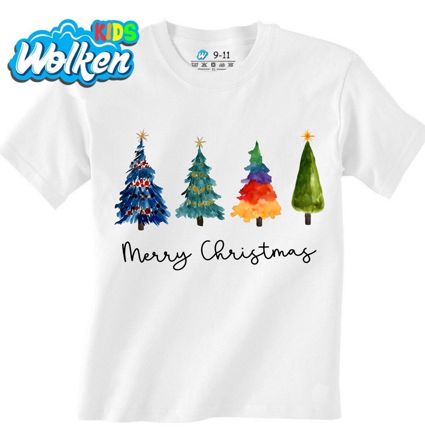 Dětské tričko Vánoční barevné stromky. Oslavte Vánoce stylově a s kapkou umění! Tento akvarelový motiv se čtyřmi originálně malovanými vánočními stromečky a nápisem „Merry Christmas“ potěší každého milovníka minimalistického designu a ručně malovaného stylu.