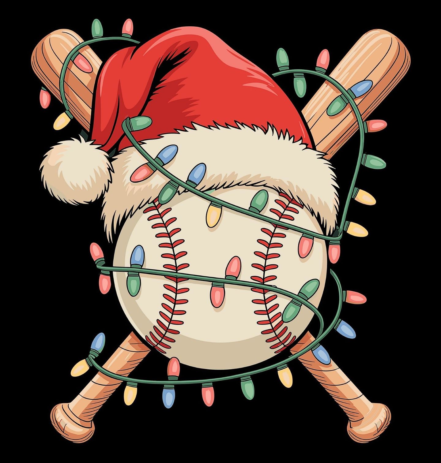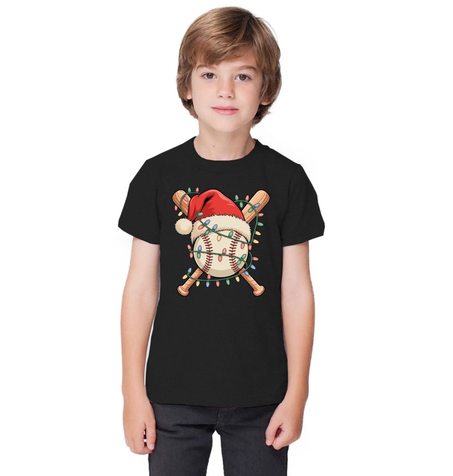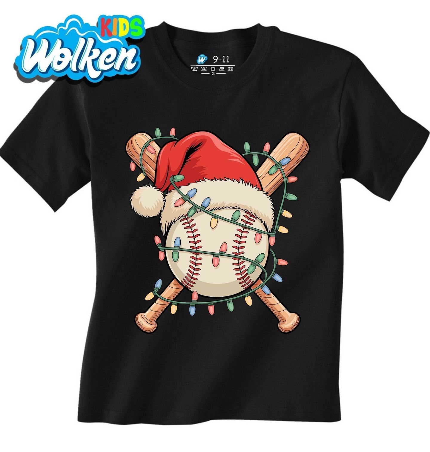 Dětské tričko Vánoční Baseballový Míček. Tento veselý sportovní motiv potěší každého fanouška baseballu! Design zobrazuje baseballový míček ozdobený čepicí Santa Clause a ovázaný vánočními světýlky, s dvěma zkříženými pálkami v pozadí. Vánoce mohou být i ve znamení sportu!