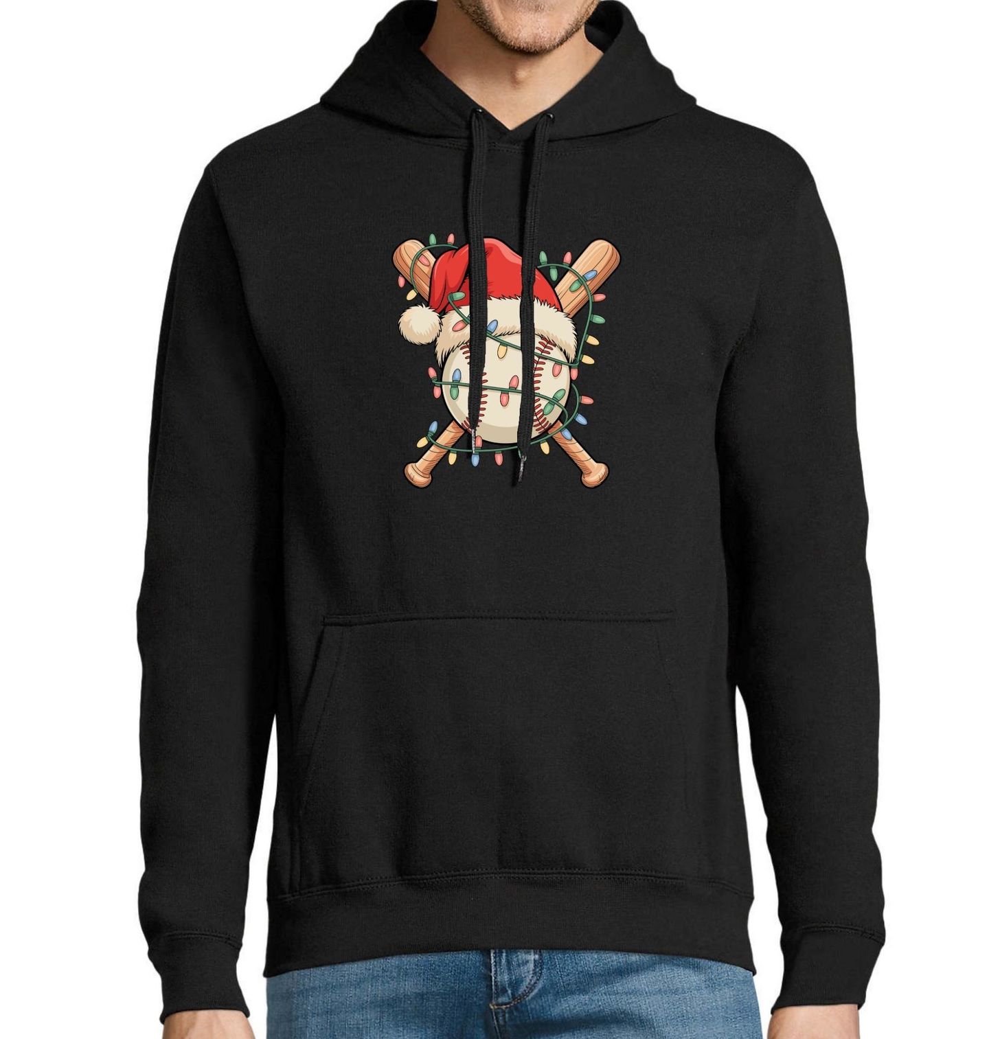 Pánská mikina Vánoční Baseballový Míček. Tento veselý sportovní motiv potěší každého fanouška baseballu! Design zobrazuje baseballový míček ozdobený čepicí Santa Clause a ovázaný vánočními světýlky, s dvěma zkříženými pálkami v pozadí. Vánoce mohou být i ve znamení sportu!