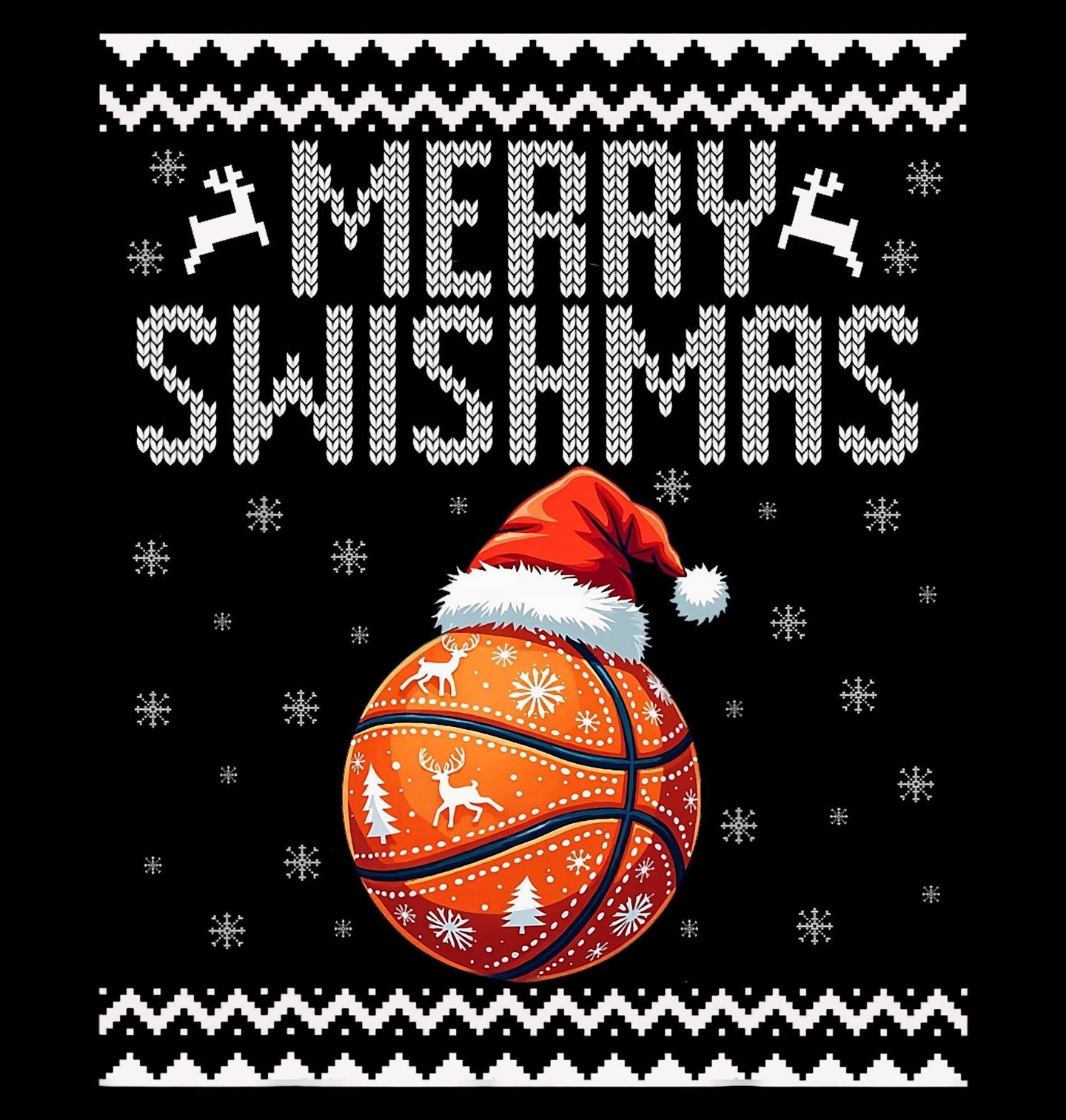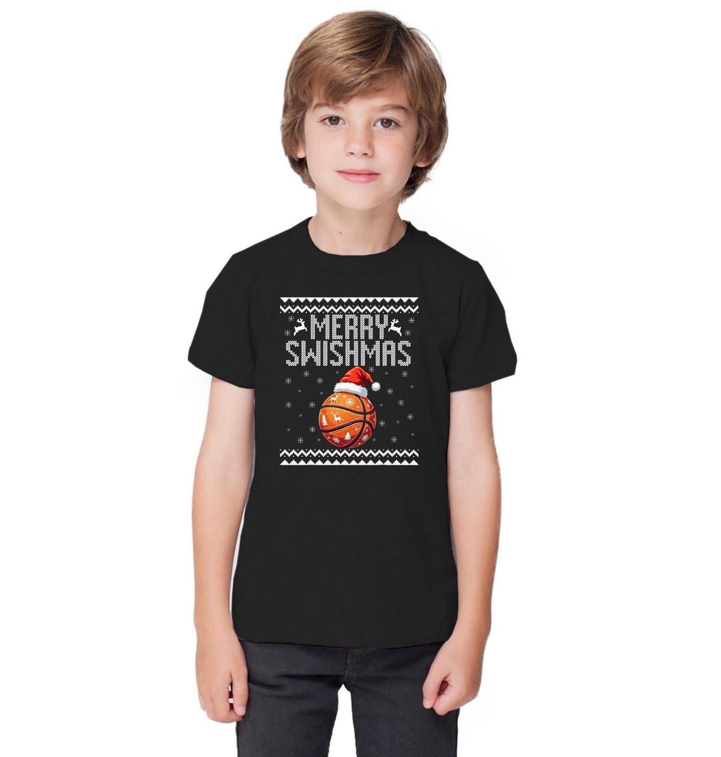 Dětské tričko Vánoční Basketbalový Míč Merry Swishmas. Na motivu je anglický text „Merry Swishmas“, což je slovní hříčka spojující tradiční „Merry Christmas“ a basketbalový výraz swish (čistý hod bez doteku obroučky). . Basketbalový míč s vánoční čepicí, ozdobený soby, vločkami a stromečky, vytváří dokonalý design ve stylu ugly sweater na Vánoce.