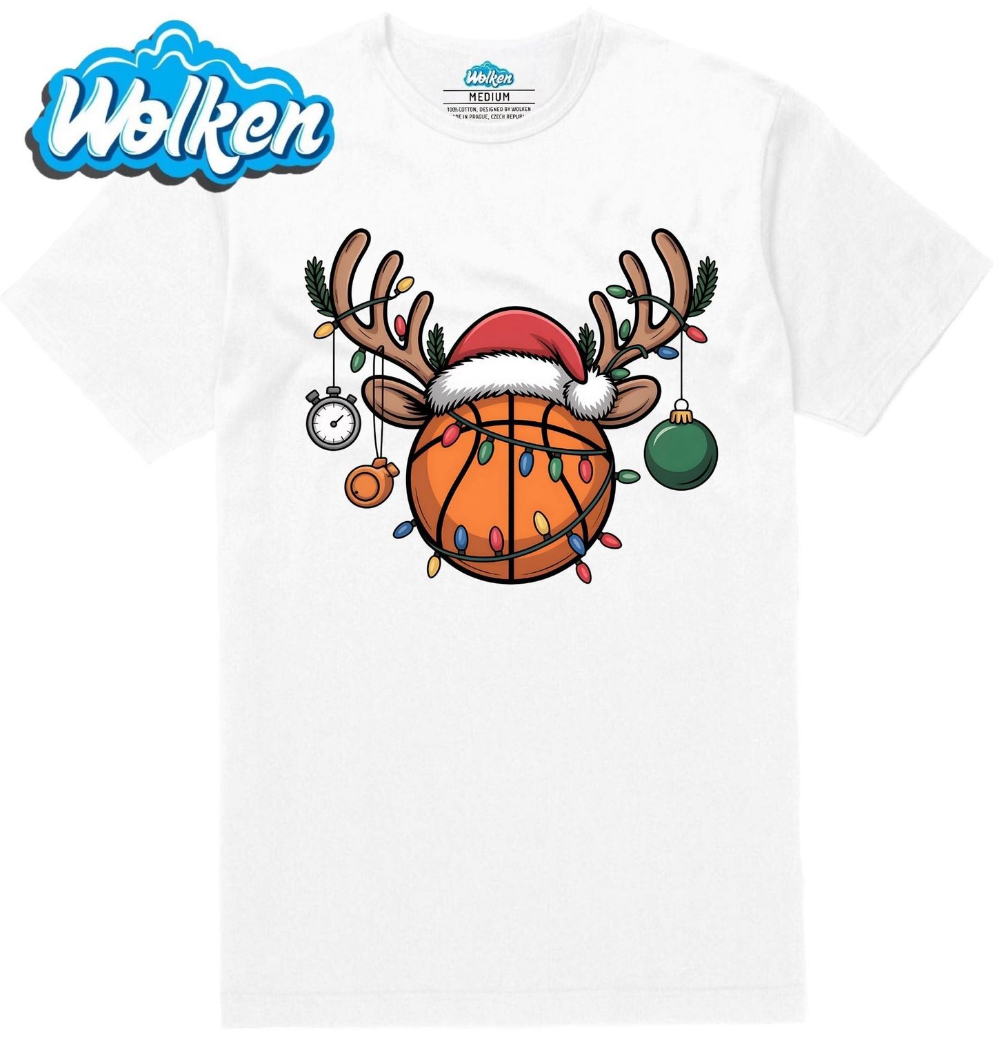Pánské tričko Vánoční Basketbalový Míč s Parohy. Vánoce mohou mít sportovní šmrnc! Originální design, kde se basketbalový míč proměnil v roztomilého soba, přináší do sváteční sezóny hravost i lásku ke sportu. Míč je ozdoben parohy, na kterých visí vánoční ozdoby, světýlka a stopky, a nechybí samozřejmě ani Santova čepice.