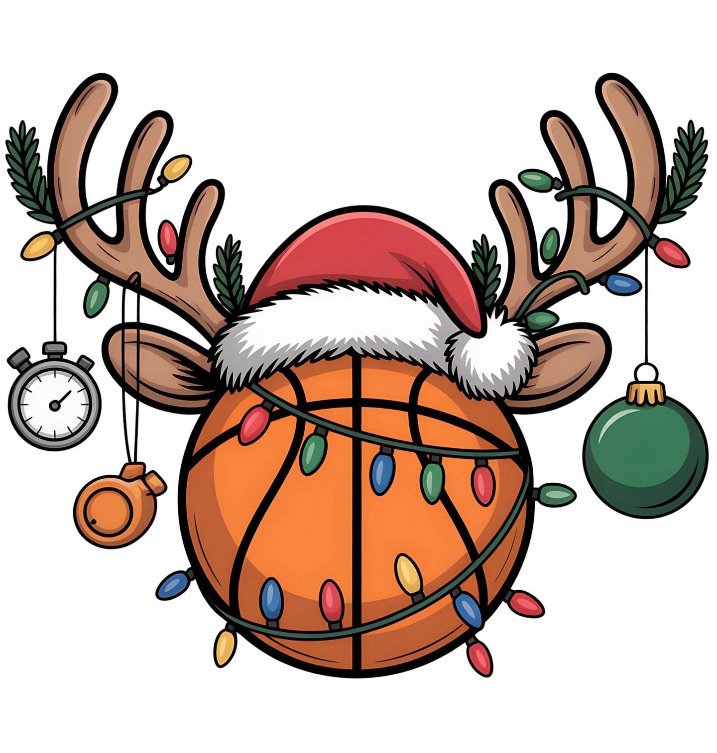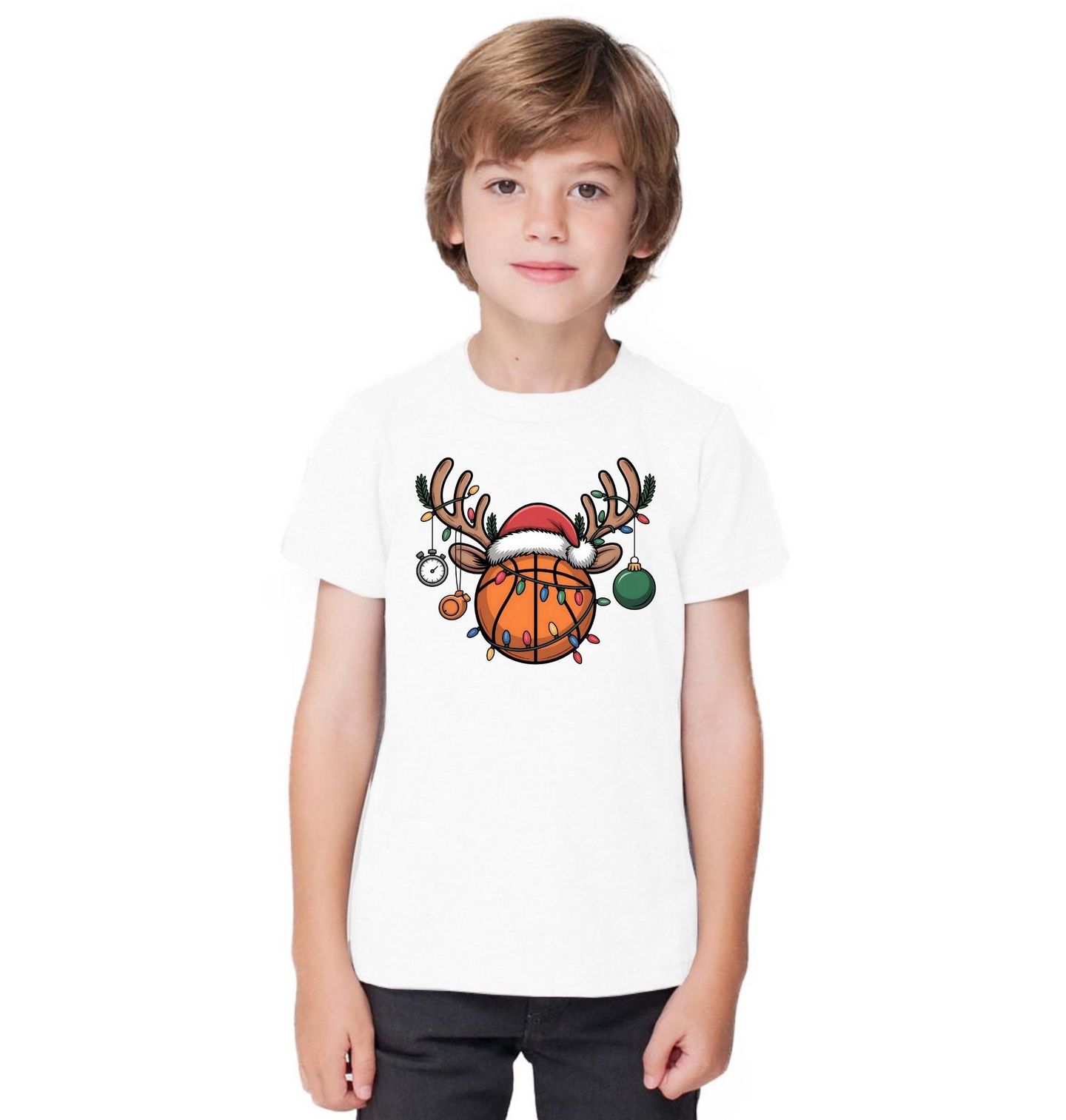 Dětské tričko Vánoční Basketbalový Míč s Parohy. Vánoce mohou mít sportovní šmrnc! Originální design, kde se basketbalový míč proměnil v roztomilého soba, přináší do sváteční sezóny hravost i lásku ke sportu. Míč je ozdoben parohy, na kterých visí vánoční ozdoby, světýlka a stopky, a nechybí samozřejmě ani Santova čepice.