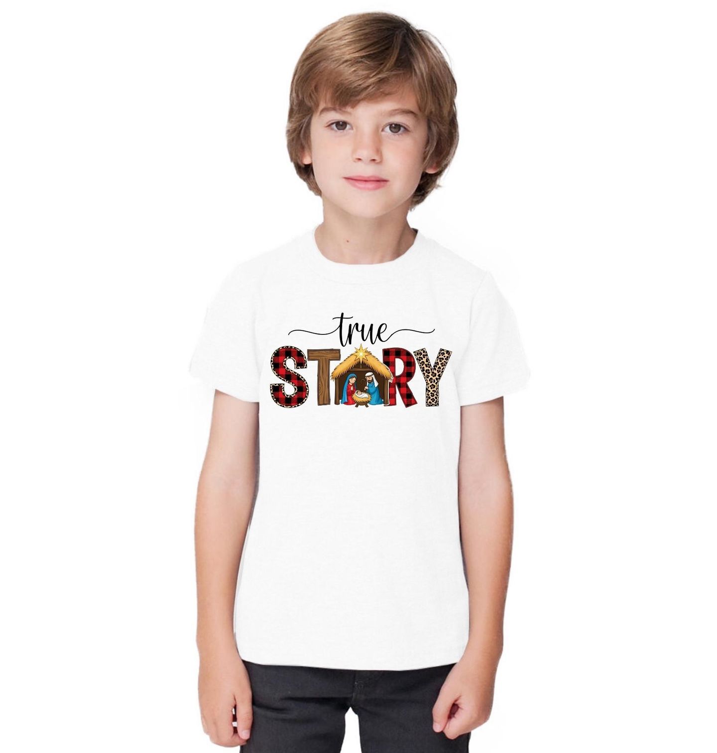 Dětské tričko Vánoční Betlém True Story. Vánoce jsou víc než jen dárky a stromeček – připomeňte si pravý smysl těchto svátků s tímto nádherným motivem s nápisem „True Story“ (Pravdivý příběh), který znázorňuje narození Ježíše Krista v Betlémě. Ideální pro všechny, kdo chtějí oslavit Vánoce s vírou, láskou a hlubším poselstvím.