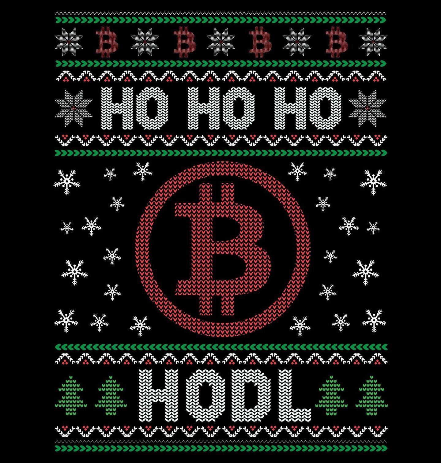 Pánské tričko Vánoční Bitcoin Ho Ho Ho HODL. Vánoce, ugly sweater a bitcoin? Lepší kombinaci by Satoshi sám nevymyslel! Tento sváteční motiv propojuje tradiční vánoční vzory s ikonou kryptosvěta – Bitcoinem. „HODL“ je slavný výraz z kryptosvěta, vznikl jako překlep slova „HOLD“ (držet), ale dnes má v kryptoměnové komunitě význam: „Nevzdávej se, i když to padá!“