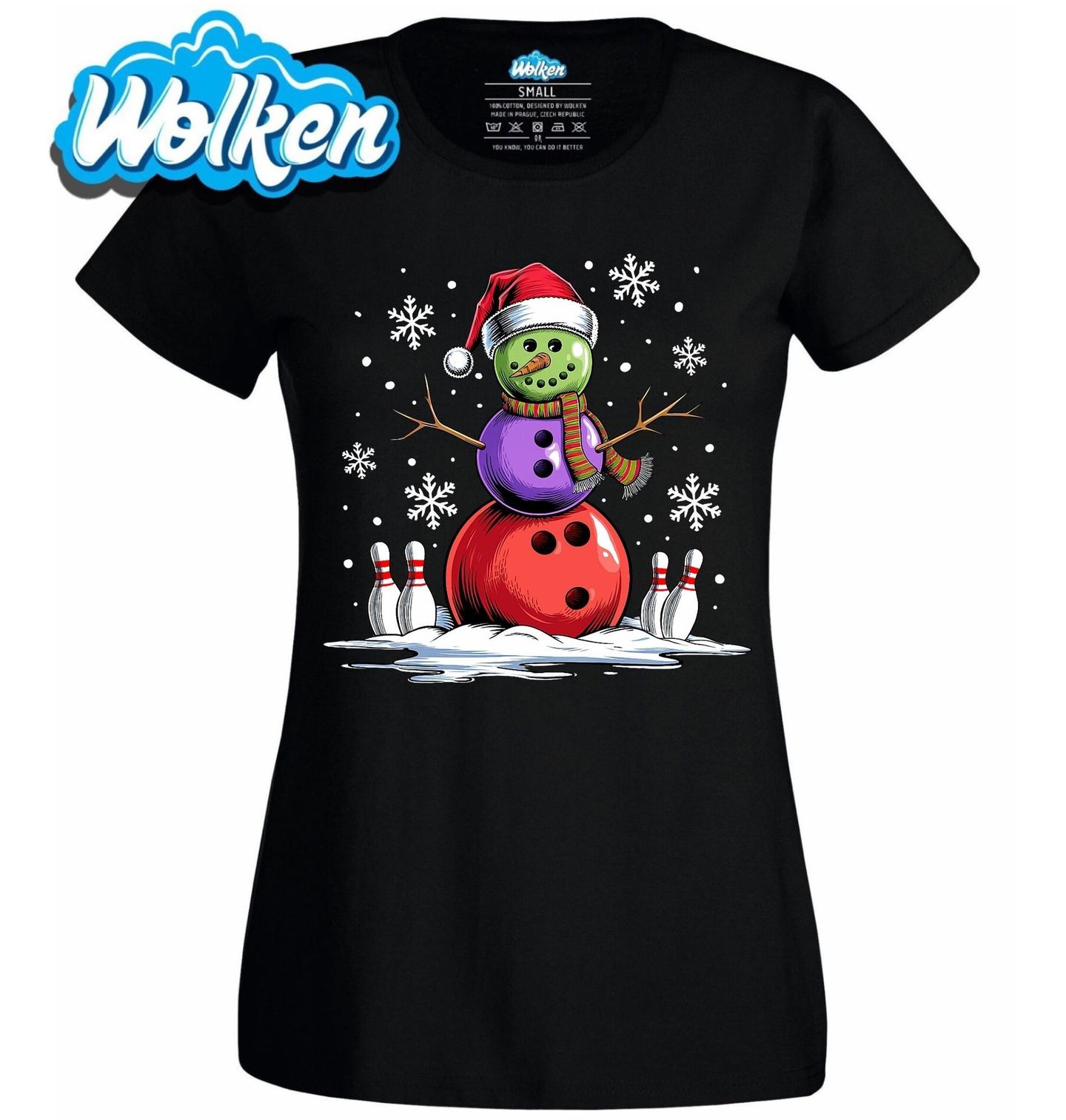 Dámské tričko Vánoční Bowlingový Sněhulák. Když se řeknou Vánoce, vybaví se nám pohoda, dárky a zimní radovánky. Tento originální motiv ale spojuje svátky se sportem – sněhulák je poskládaný z bowlingových koulí a obklopený kuželkami. Ideální dárek pro hráče, fanoušky i všechny, kdo chtějí oslavit Vánoce s humorem a originálním stylem.