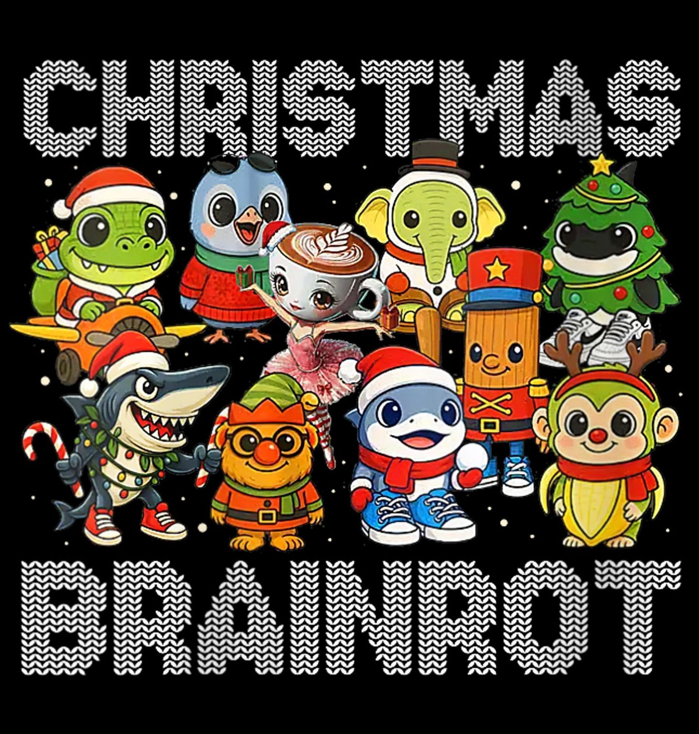 Dětské tričko Vánoční Brainrot Christmas Brainrot. Tady přichází Vánoce ve své nejšílenější podobě – italský brainrot v celé své kráse! Barevná směs zvířátek, kávy, stromků a dalších postaviček s vánočními čepicemi a neidentifikovatelným chaosem tě vtáhne do světa, kde Vánoce dávno ztratily smysl…
