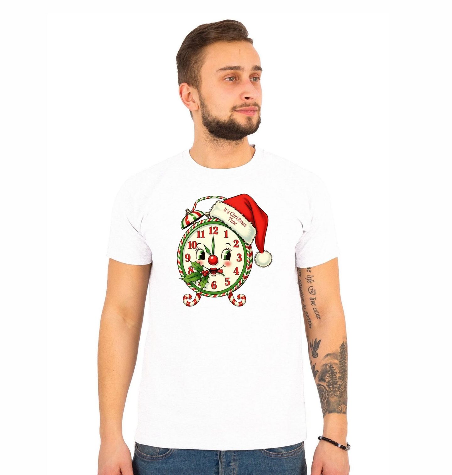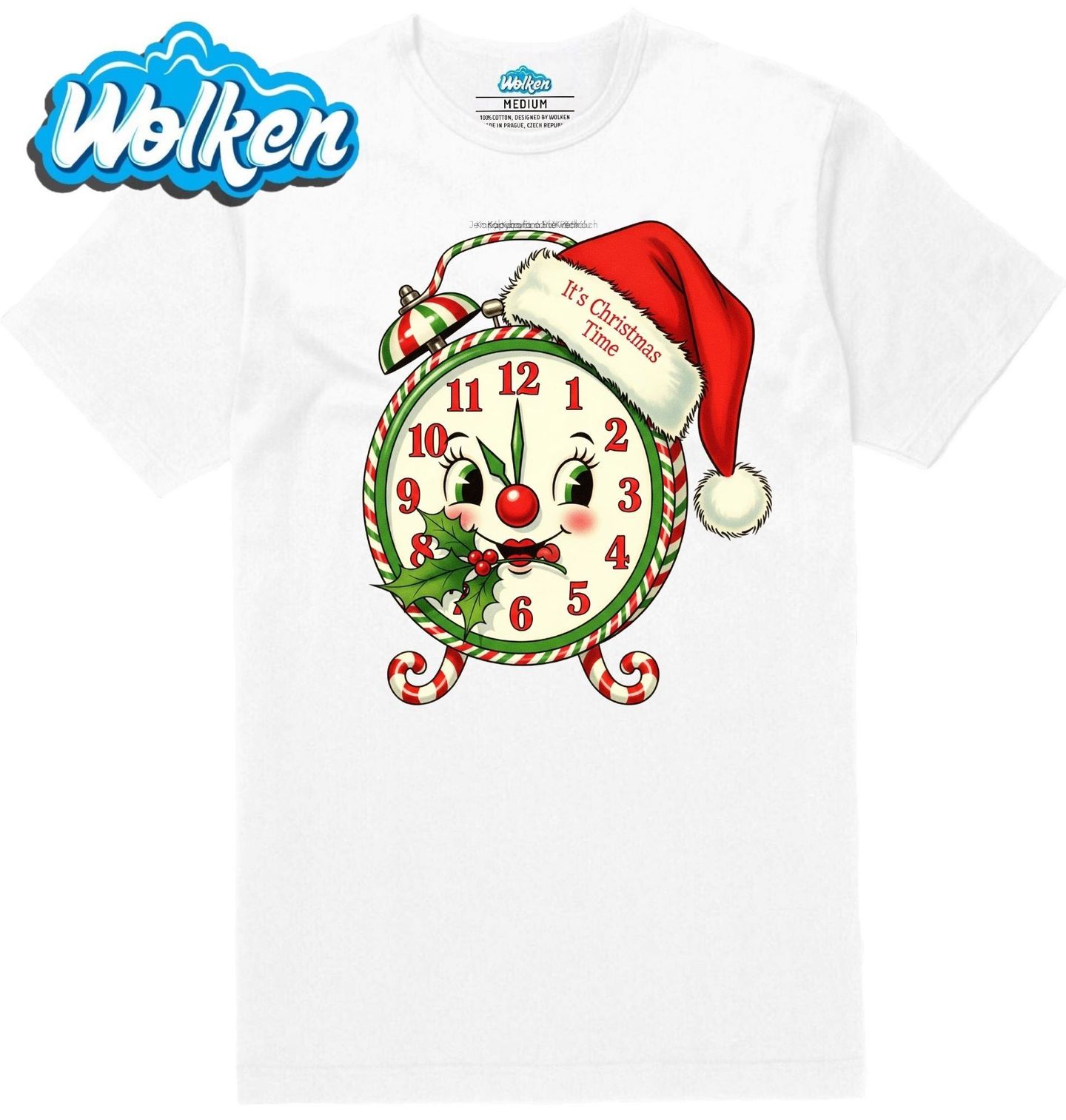 Pánské tričko Vánoční Budík Už je čas na Vánoce! Rozkošný motiv vánočního budíku připomíná, že Vánoce jsou za rohem! Tento hravý retro design s usměvavým budíkem v čepici Santa Clause a nápisem „It’s Christmas Time“ potěší každého milovníka sváteční atmosféry.