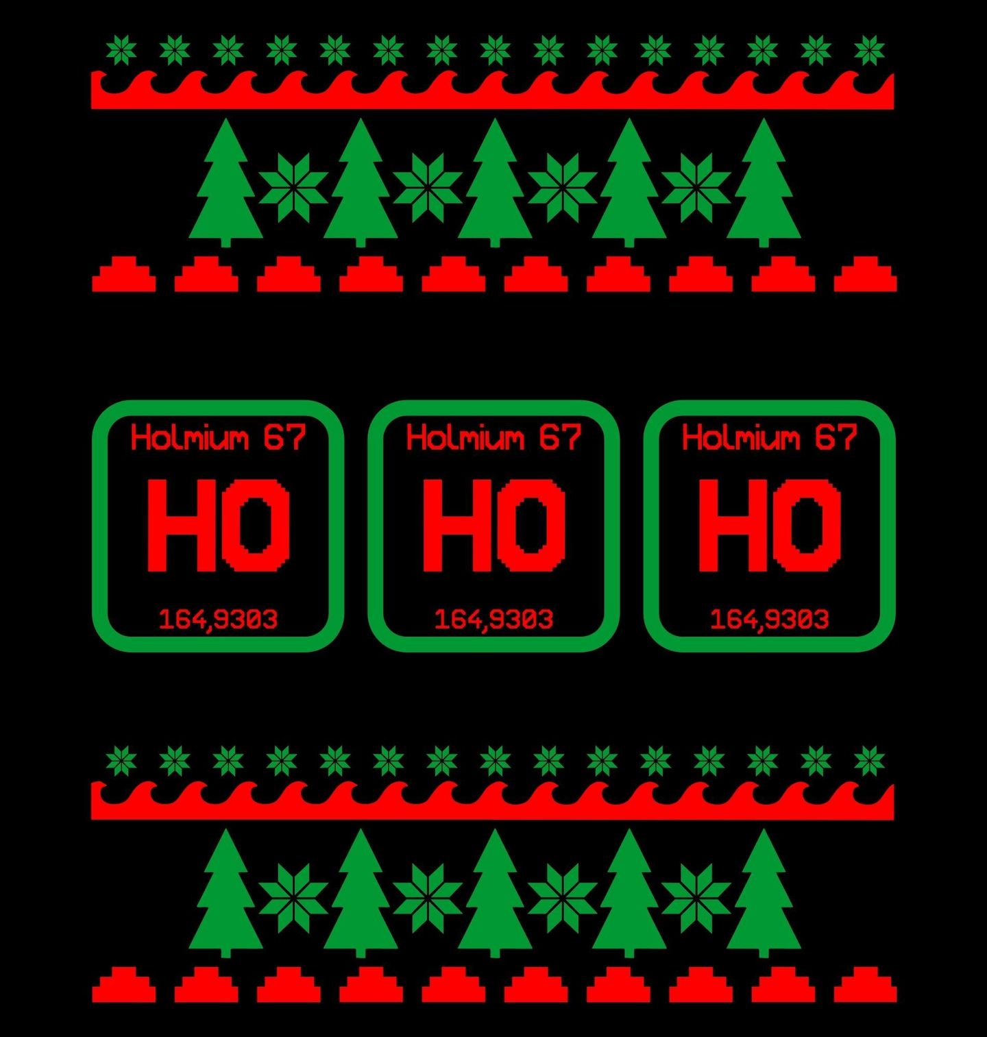 Pánské tričko Vánoční Chemické prvky Ho-Ho-Ho. Veselé a vědecky přesné Vánoce jsou tady! Tento originální ugly sweater s chemickým prvkem Holmium (Ho) třikrát opakuje slavné vánoční „Ho Ho Ho“ — ale tentokrát podle periodické tabulky prvků. Ideální pro každého fanouška vědy, chemie nebo prostě někoho, kdo miluje netradiční humor.