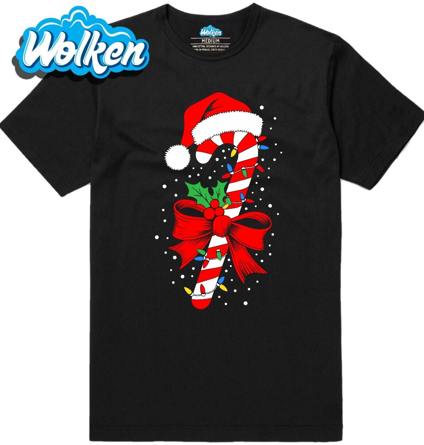 Pánské tričko Vánoční Cukrová Hůlka. Když se řeknou Vánoce, nesmí chybět sladkosti a typické dekorace. Tento motiv přináší tradiční vánoční cukrovou hůlku, ozdobenou červenou mašlí, cesmínou, světýlky a čepicí Santa Clause. Ideální pro všechny, kdo milují vánoční pohodu, barvy a klasické sladké symboly Vánoc.