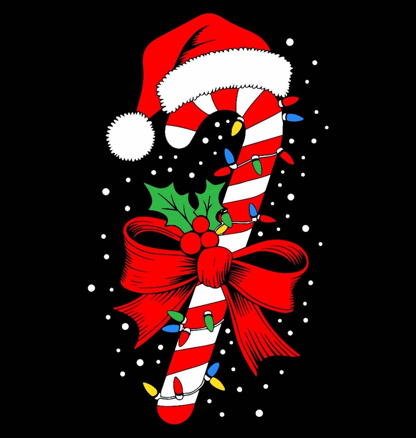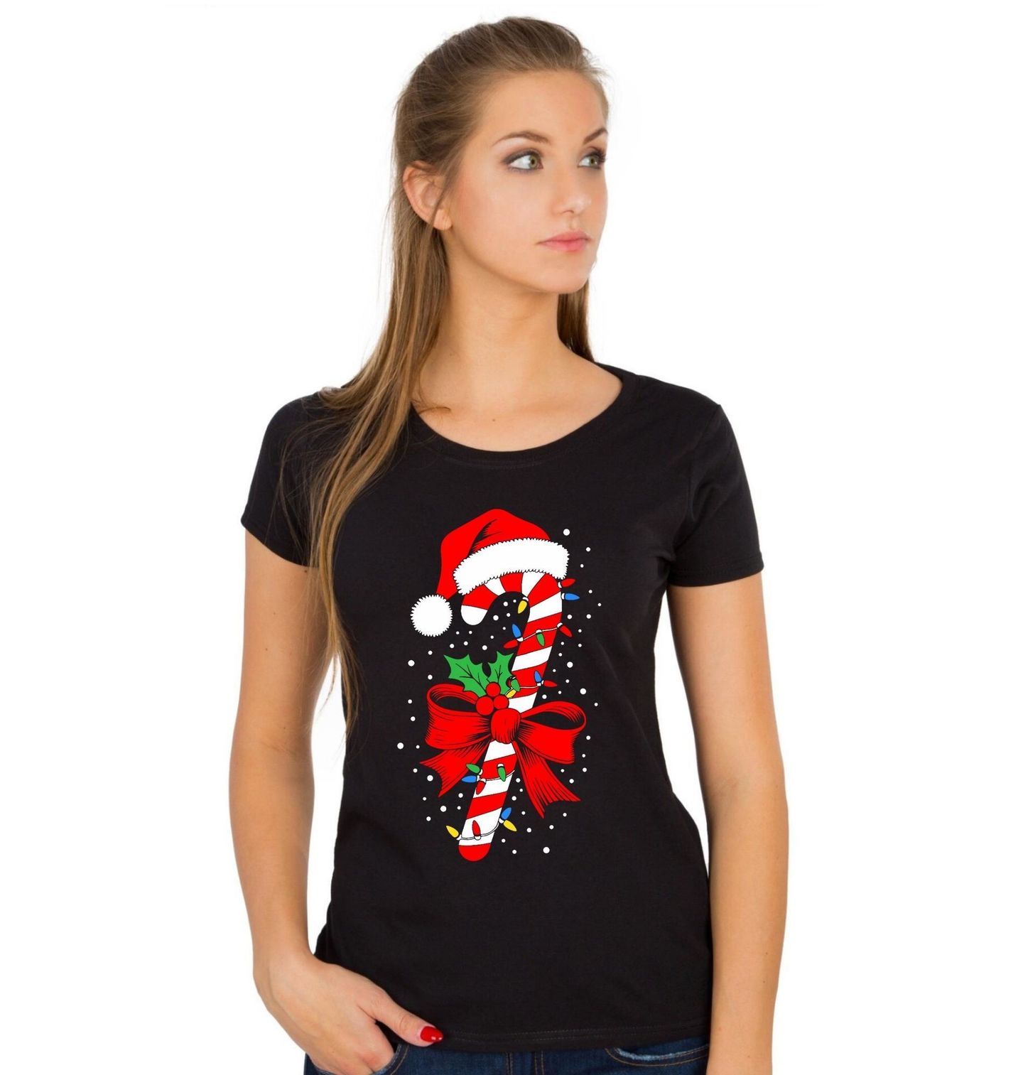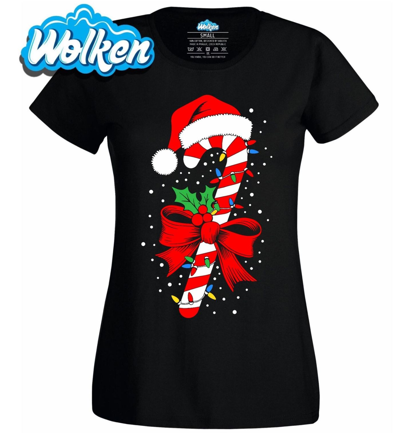 Dámské tričko Vánoční Cukrová Hůlka. Když se řeknou Vánoce, nesmí chybět sladkosti a typické dekorace. Tento motiv přináší tradiční vánoční cukrovou hůlku, ozdobenou červenou mašlí, cesmínou, světýlky a čepicí Santa Clause. Ideální pro všechny, kdo milují vánoční pohodu, barvy a klasické sladké symboly Vánoc.